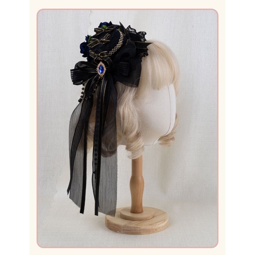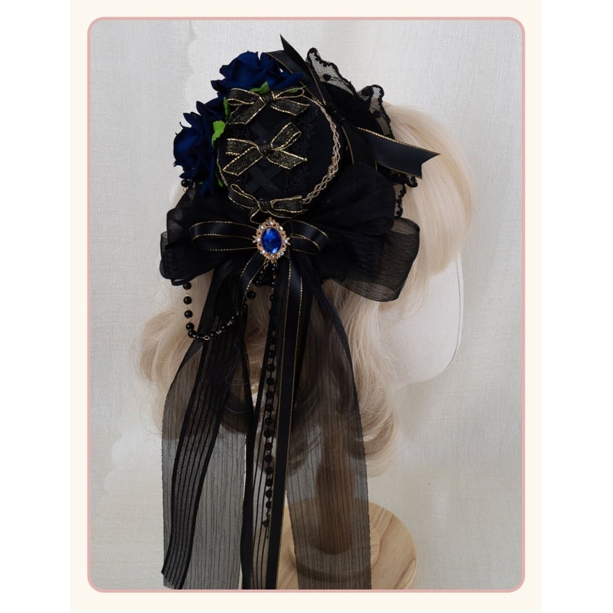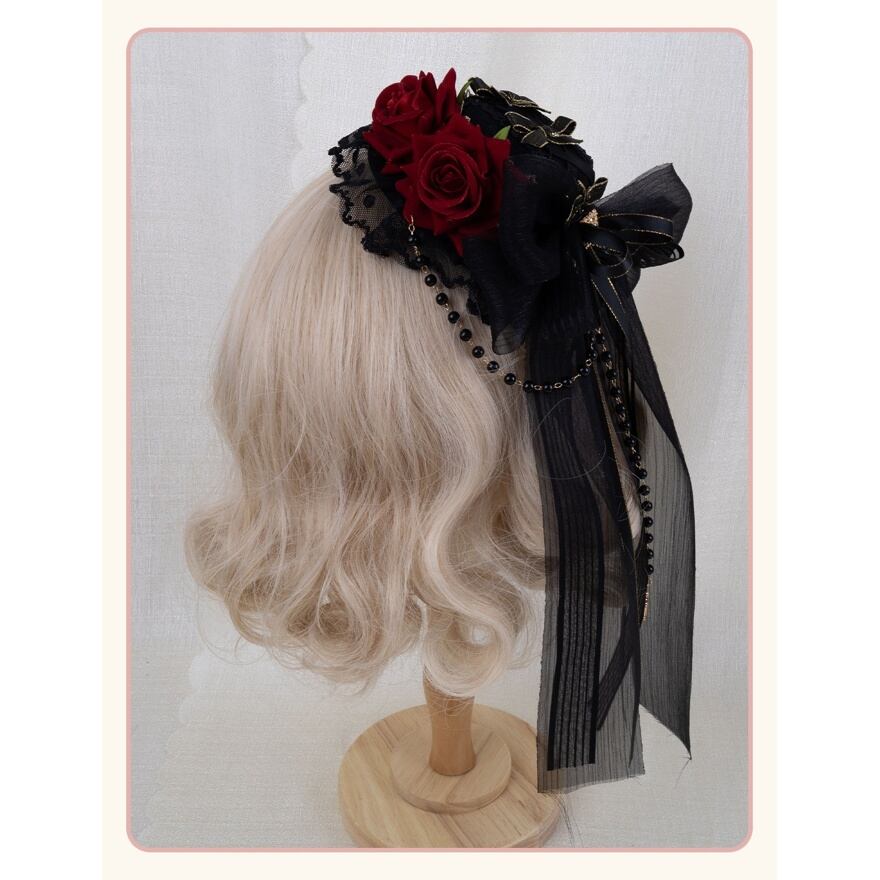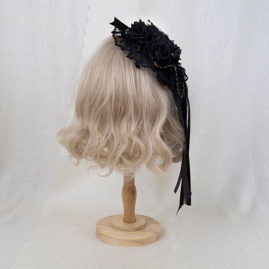 薔薇の花が静かに咲くミニハット型ヘッドドレスは、ロリィタコーデの完成度を一段引き上げる存在です。