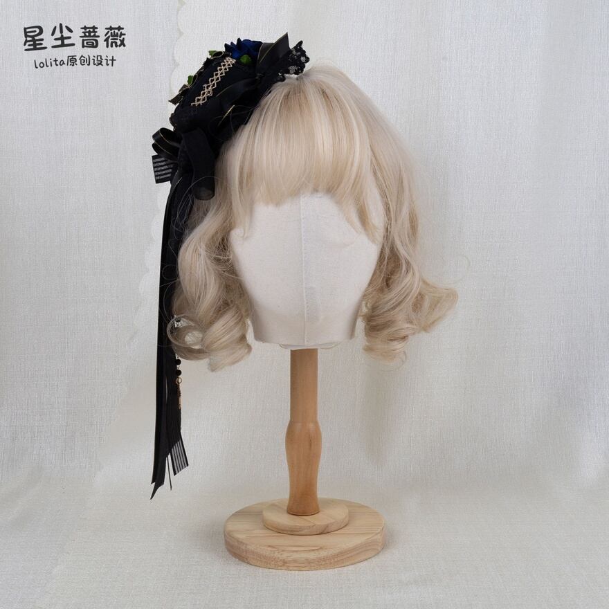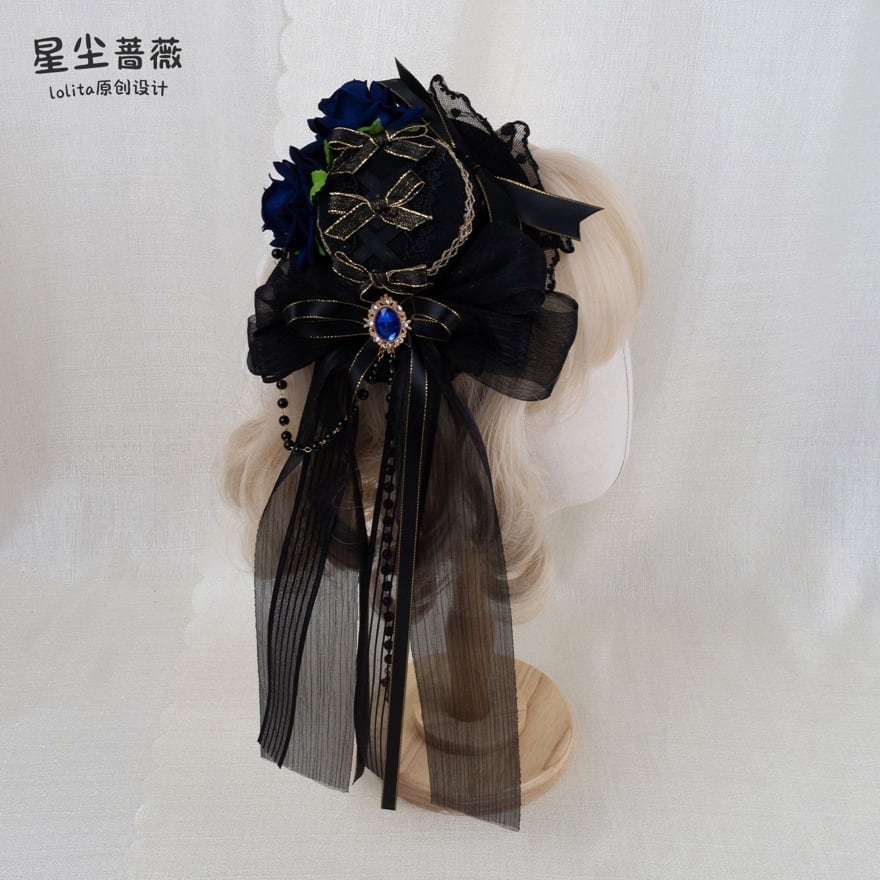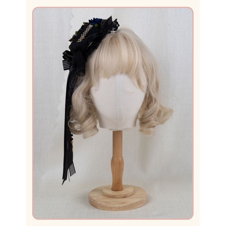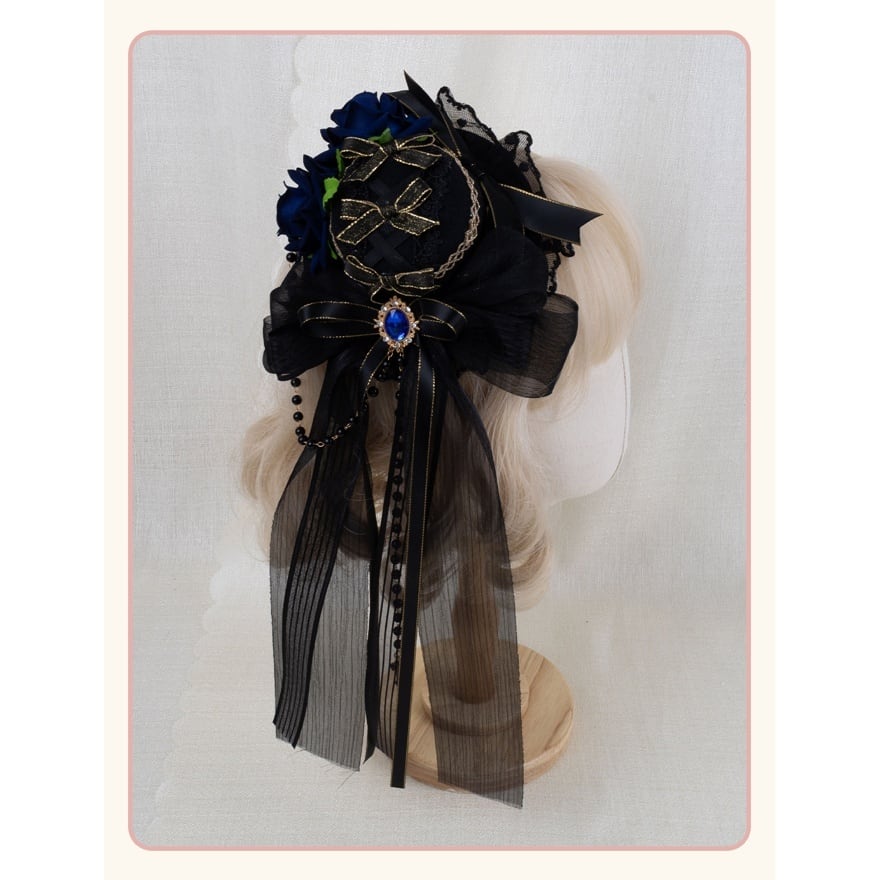 薔薇の花が静かに咲くミニハット型ヘッドドレスは、ロリィタコーデの完成度を一段引き上げる存在です。