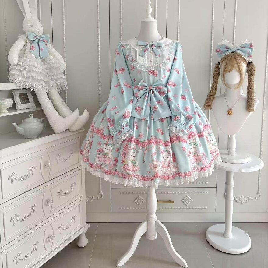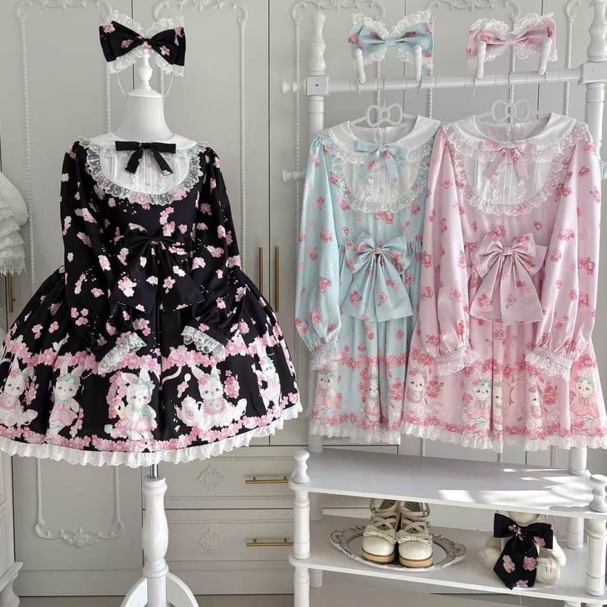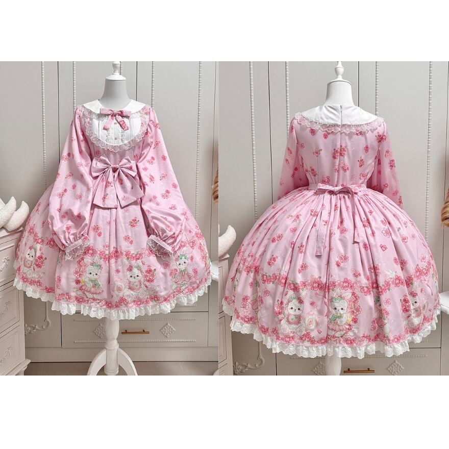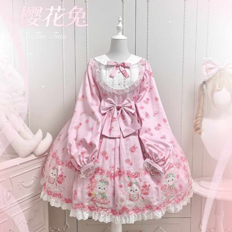 さくらの花と愛らしいうさぎモチーフをあしらった総柄プリントが印象的な、甘ロリテイストのロリィタワンピースです。