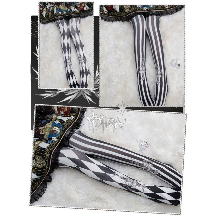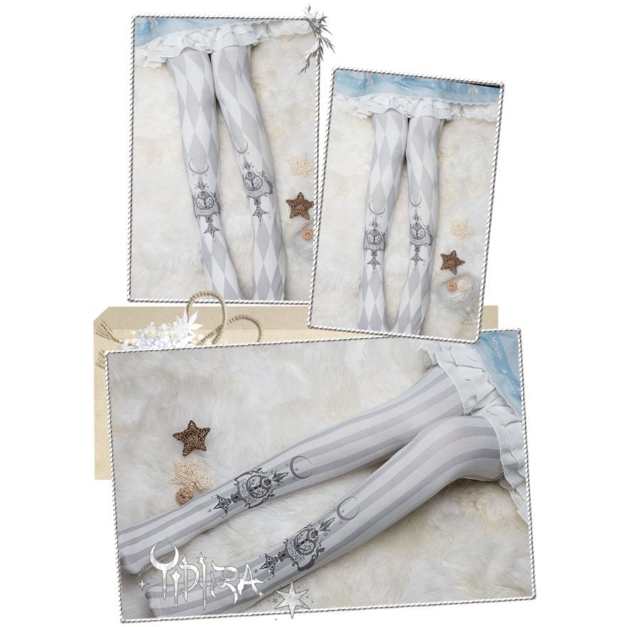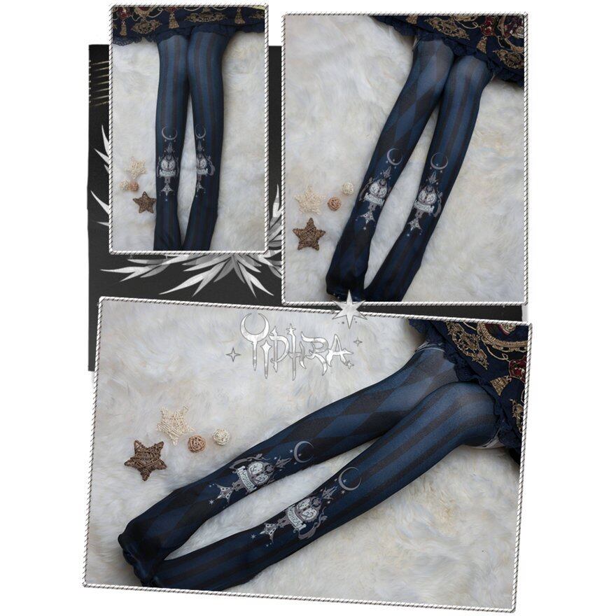 月・星・紋章モチーフを軸に、サーカスの幻想性を落とし込んだデザインタイツ。