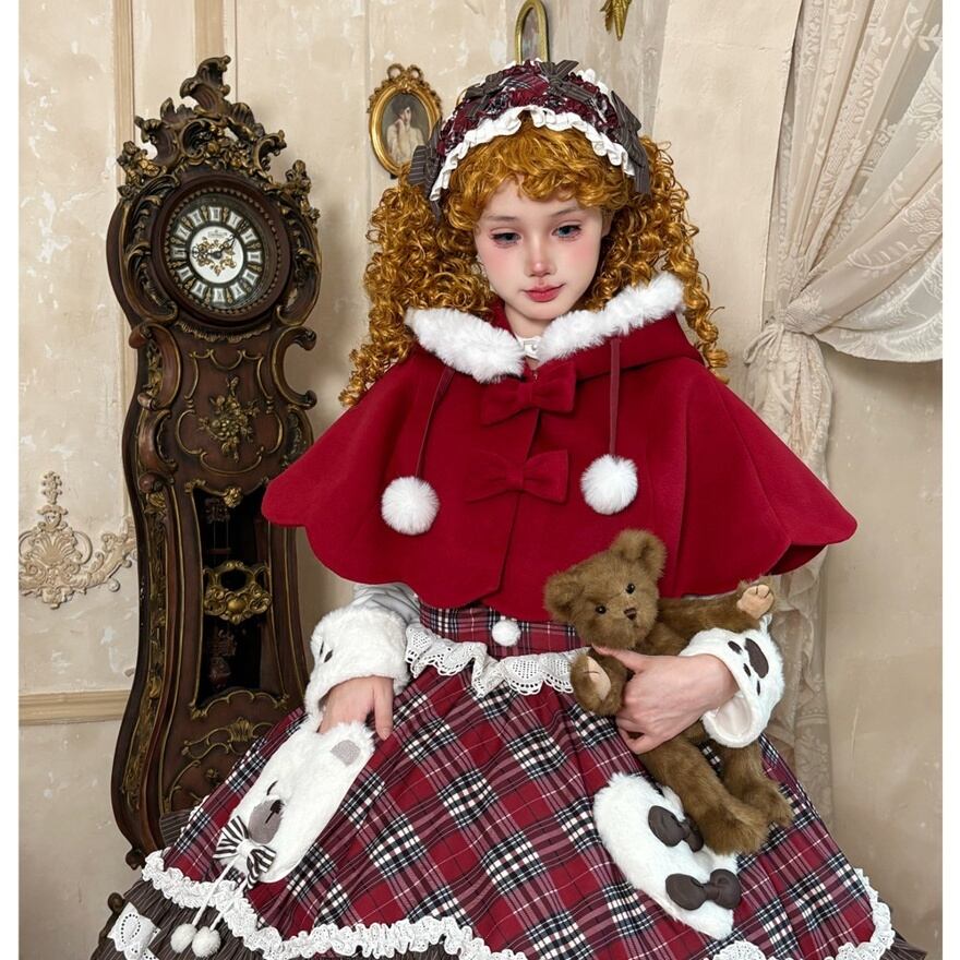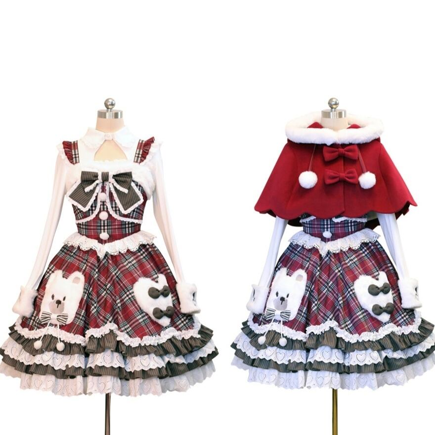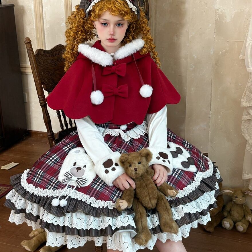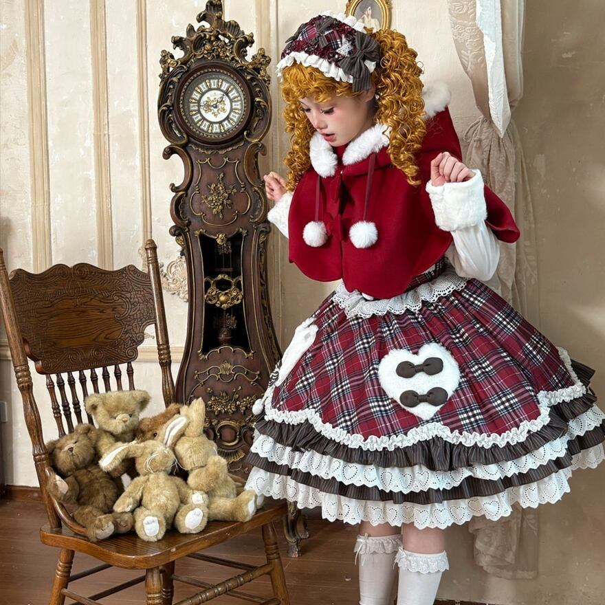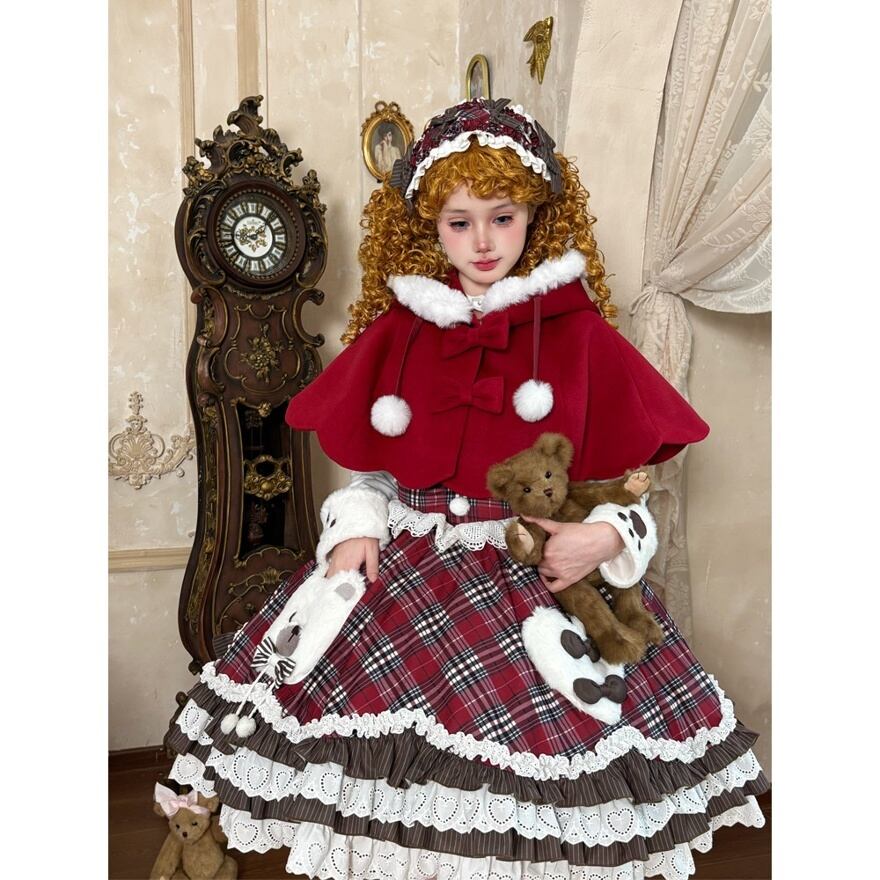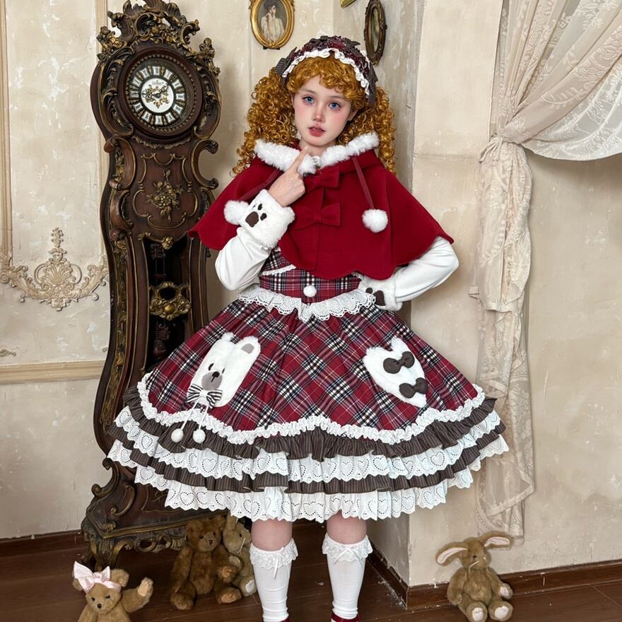 【3点セット】くま耳ケープ付 タータンチェック ロリータ ワンピース|赤 フリル レース 豪華セットアップ 冬 ロリィタ 甘ロリ 甘め