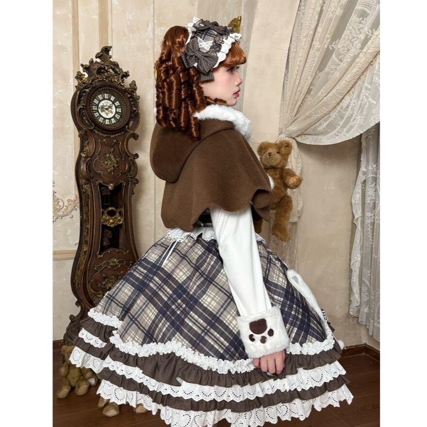 チェック柄のジャンパースカートに、ふんわりとしたケープとヘッドバンドを組み合わせた、物語性のあるロリィタセット。
