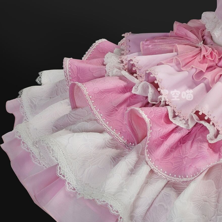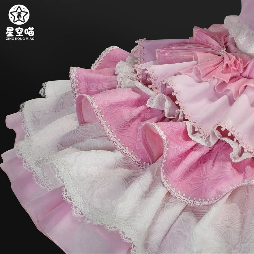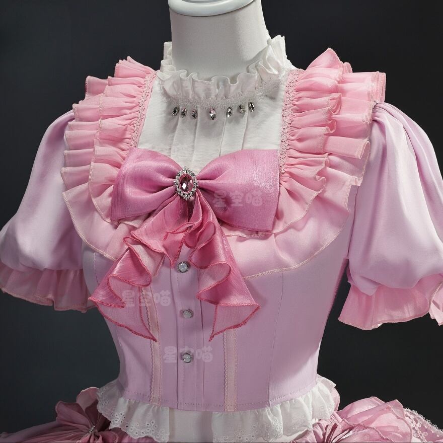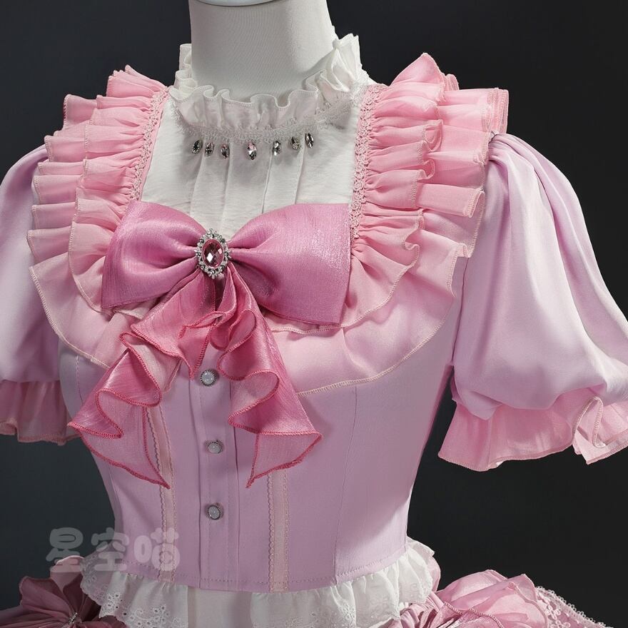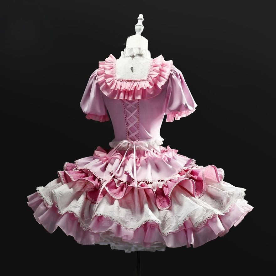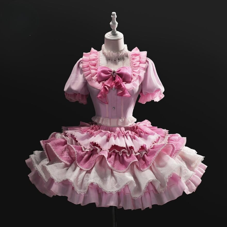 黒を基調とするゴシックロリータとは異なり、本商品はピンクを中心とした配色と多段フリル構造が特徴です。装飾がはっきりと視認できる甘ロリ系デザインで、王道スタイルを試したい初心者向けの立ち位置です。
