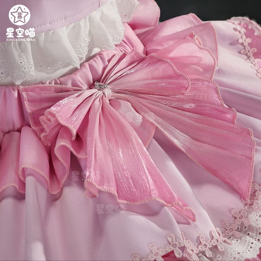 甘ロリ入門に適した、フリル装飾が特徴のロリータワンピースです。ピンクを基調とした配色に、胸元の大きなリボンと段状に重なったスカートデザインが確認できます。はじめてロリータを取り入れる方にも選びやすい、王道デザインの一着です。