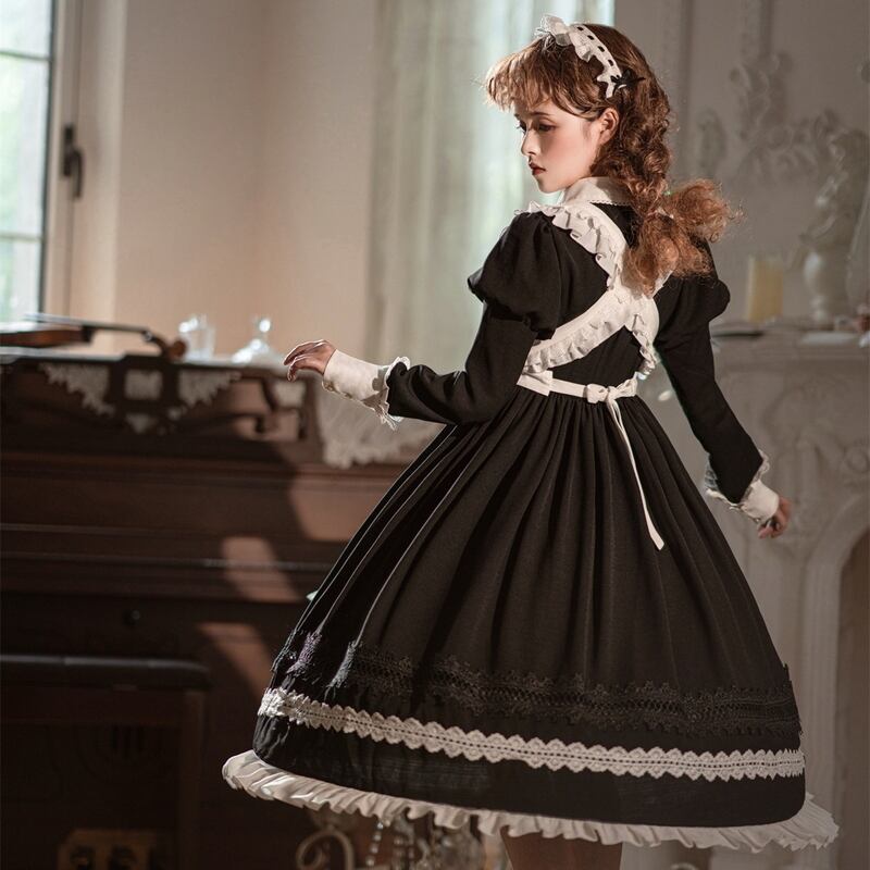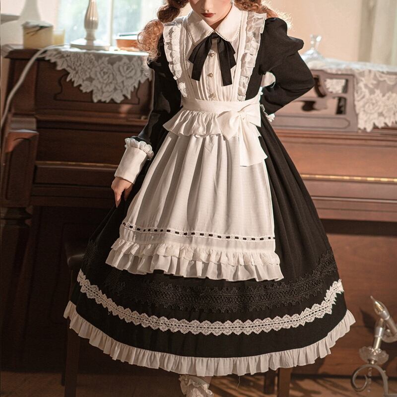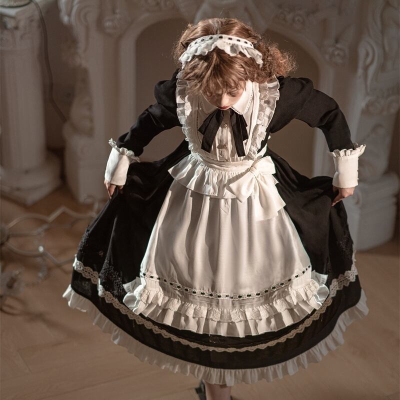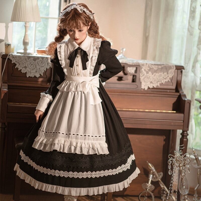 [クラシカルロリィタ] 英国風メイド服 ヘアバンドセット フリルエプロン&パフスリーブ ロング丈 ブラック | Alicestyle