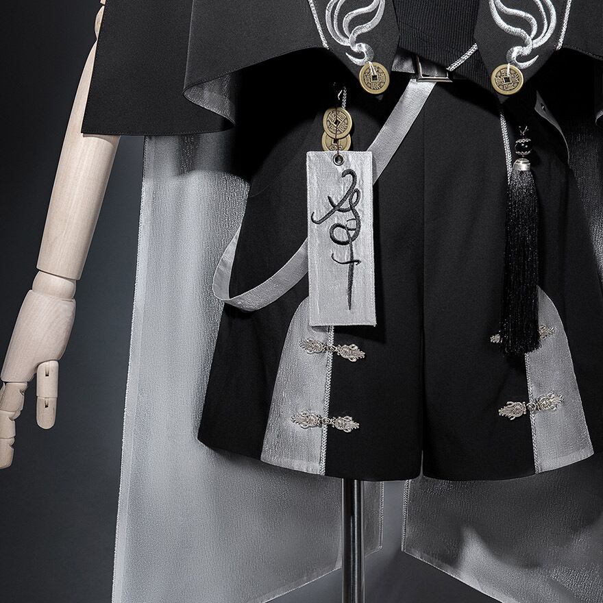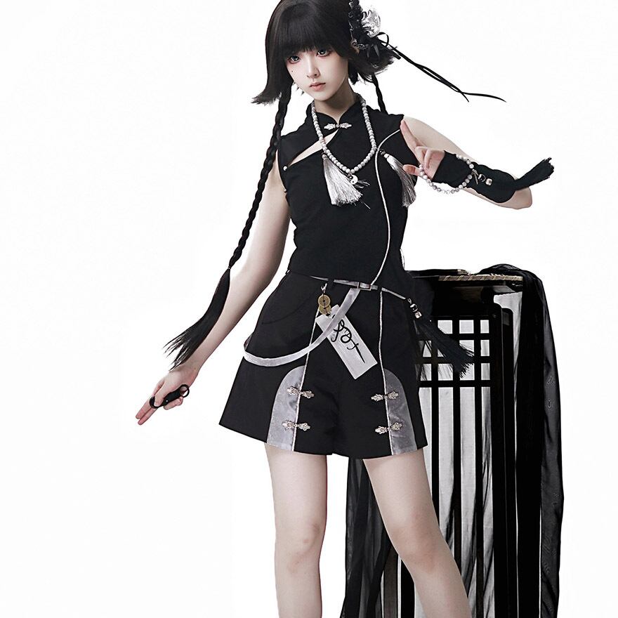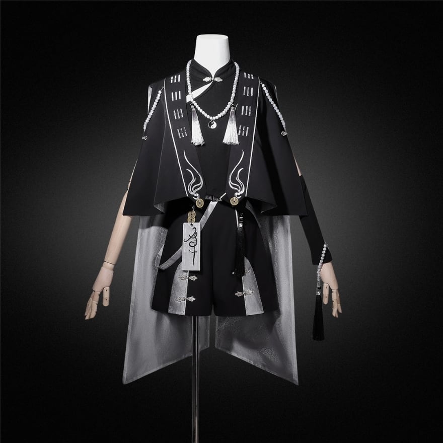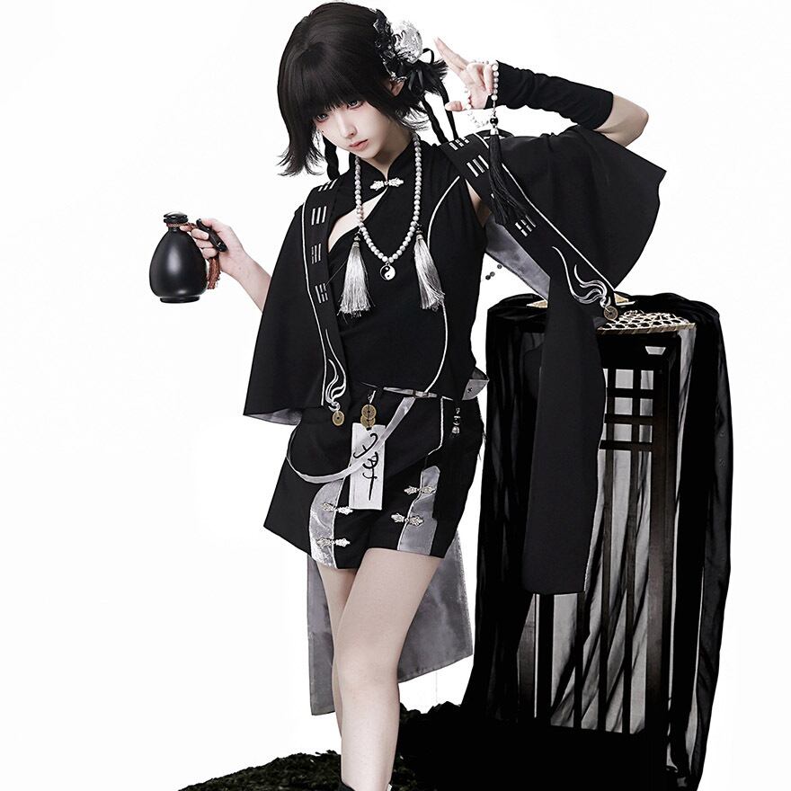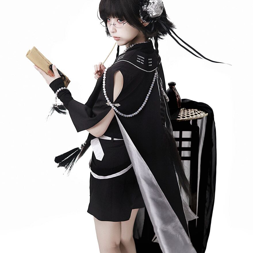 中華テイストに軍服のような凛々しさを加えた、ダークでスタイリッシュな王子系セットアップです。キョンシーを彷彿とさせるお札モチーフや数珠のような装飾が、ミステリアスな「和・中華ロリ」の世界観を演出します。Alicestyleがセレクトした、初心者の方でも一式で完璧ななりきりを楽しめる、コンセプチュアルな一着です。