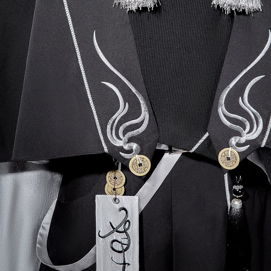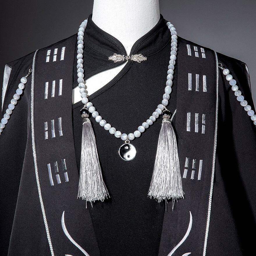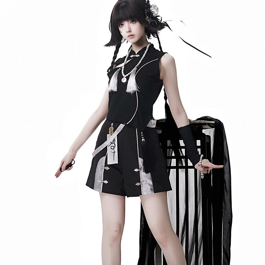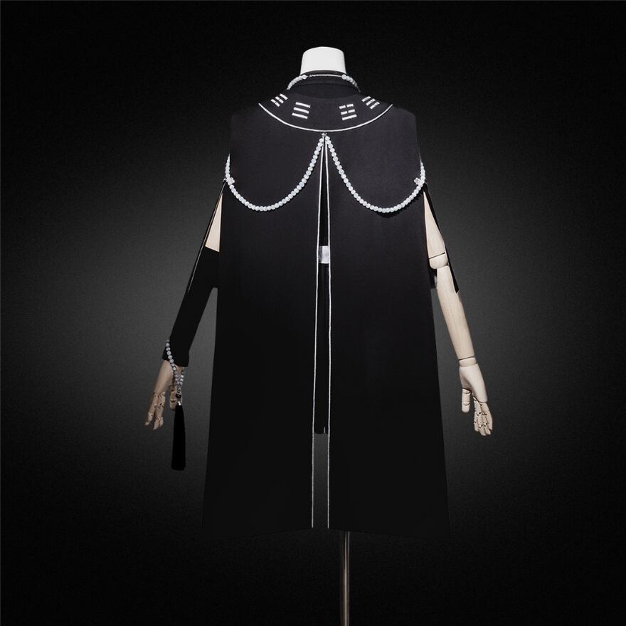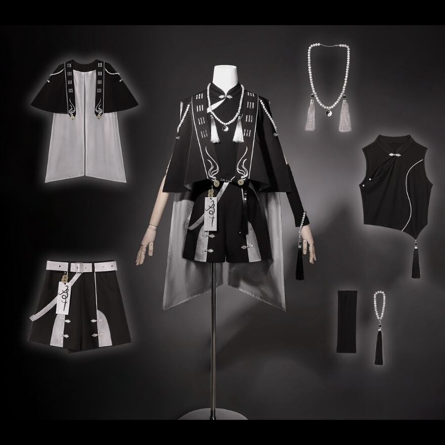 中華テイストに軍服のような凛々しさを加えた、ダークでスタイリッシュな王子系セットアップです。キョンシーを彷彿とさせるお札モチーフや数珠のような装飾が、ミステリアスな「和・中華ロリ」の世界観を演出します。Alicestyleがセレクトした、初心者の方でも一式で完璧ななりきりを楽しめる、コンセプチュアルな一着です。