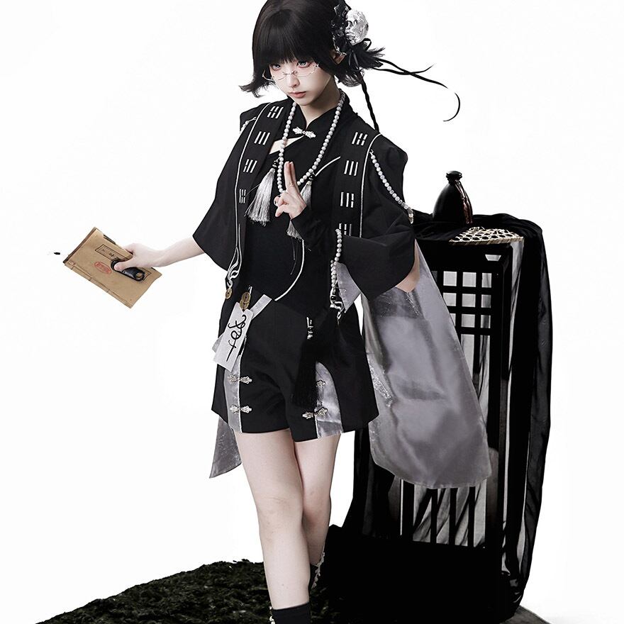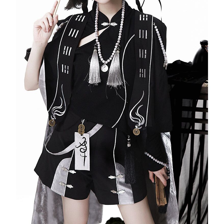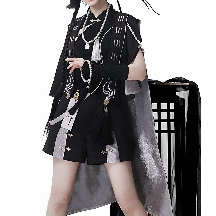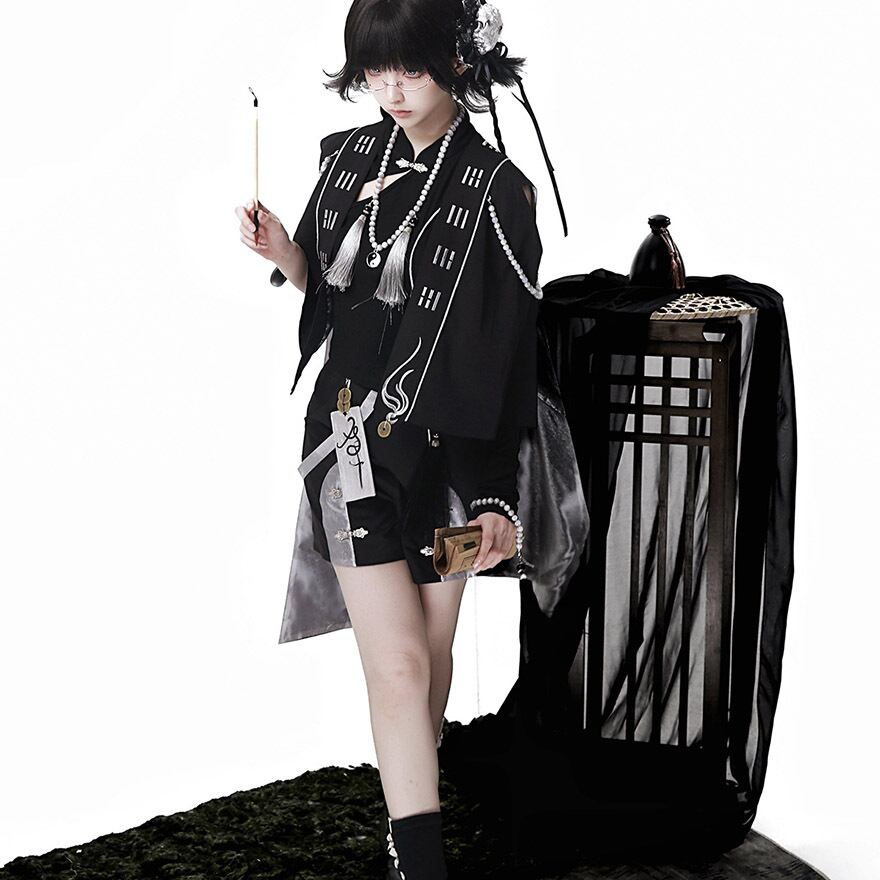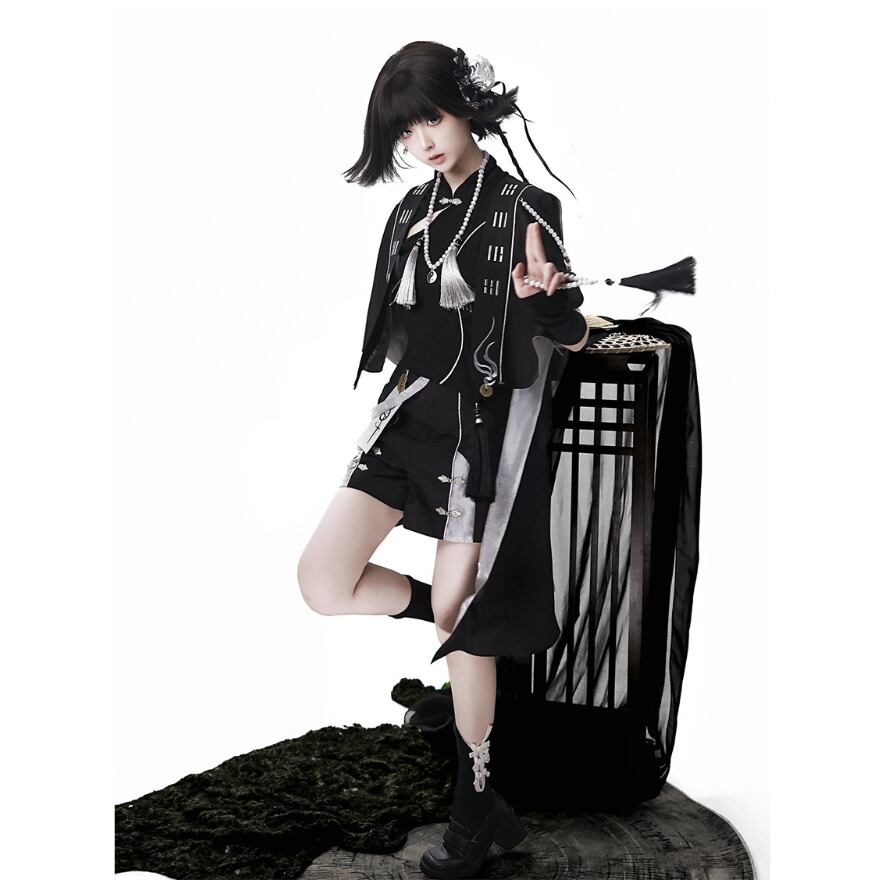 [中華ロリィタ・王子系] ライブ・撮影会用 キョンシー風デザイン マント&アシンメトリートップス&ショートパンツ ブラック×シルバー | Alicestyle