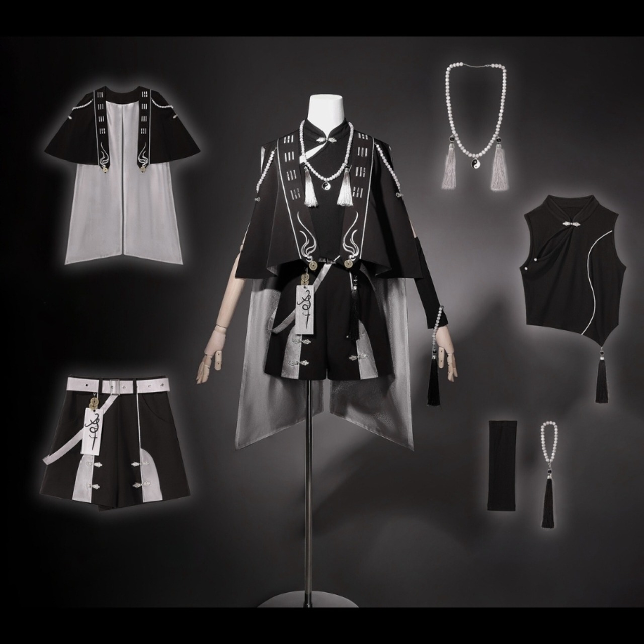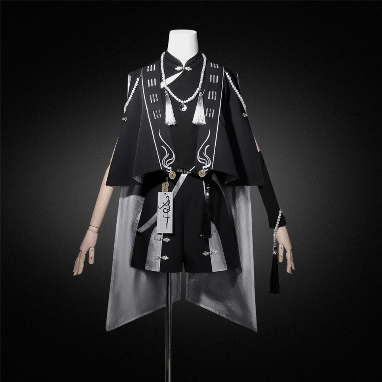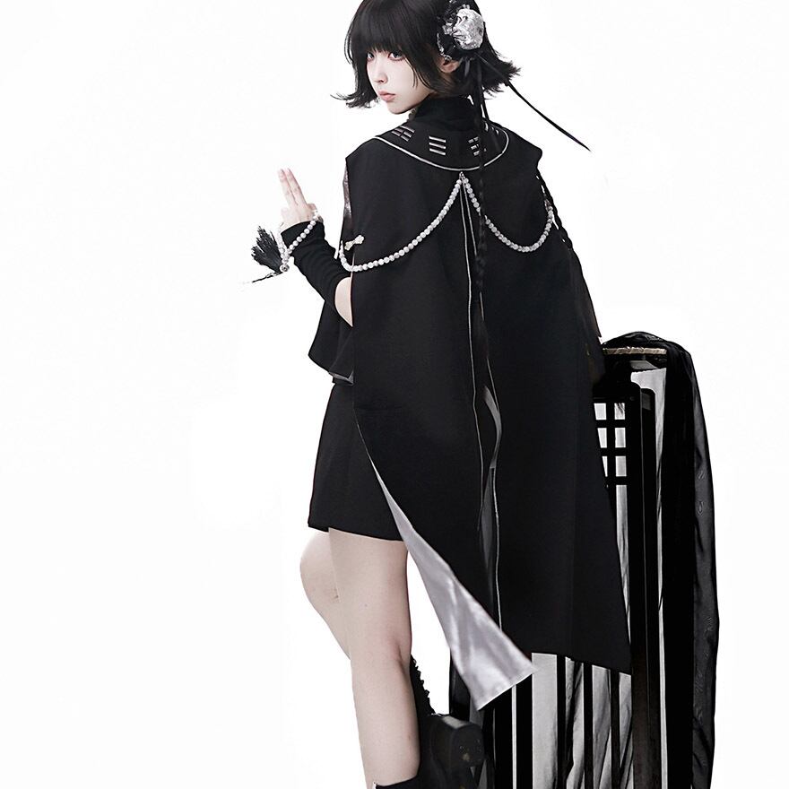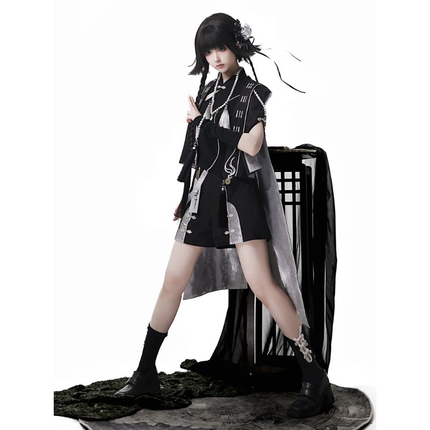 [中華ロリィタ・王子系] ライブ・撮影会用 キョンシー風デザイン マント&アシンメトリートップス&ショートパンツ ブラック×シルバー | Alicestyle