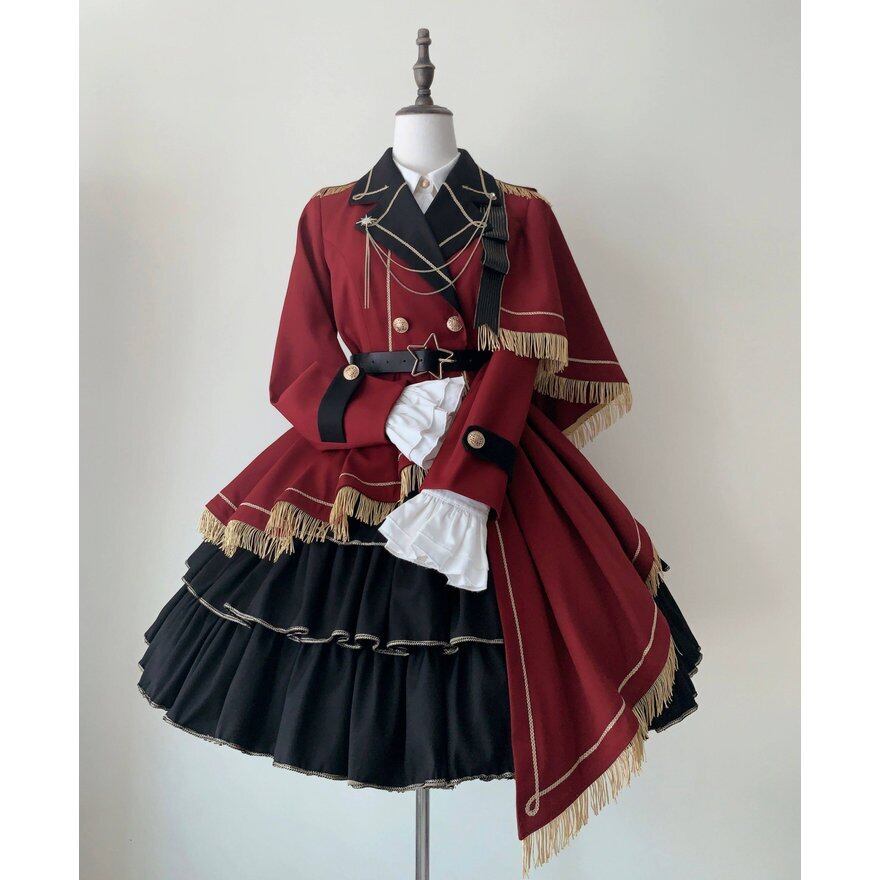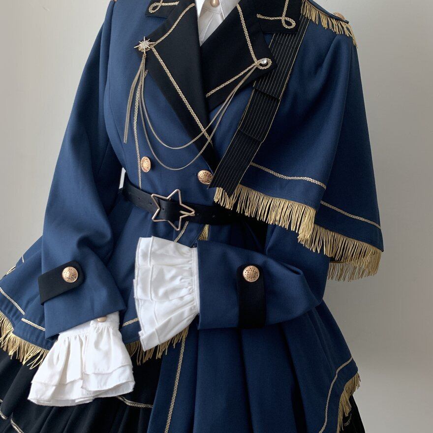 きちんとした軍服のような仕立てに、金糸のフリンジとエポレットが映える、クラシカルで凛としたミリタリージャケットです。黒の襟とパイピング、星型のベルト飾り、チェーンなど細部まで丁寧に仕上げられていて、羽織るだけで一気にコーディネートに物語性が生まれます。インナーやスカートと組み合わせることで、甘さとかっこよさのバランスを自分らしく調整できる一着です。