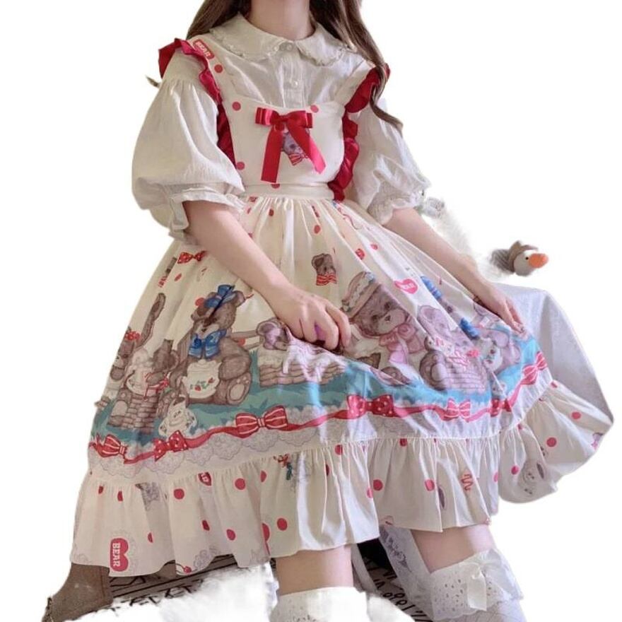 甘ロリ入門にぴったりな、くまさんとティータイム柄が愛らしいジャンパースカートです。贅沢なフリルとリボンが縁取るデザインは、お茶会やスタジオ撮影でも主役級の可愛さ。絵本の世界から飛び出したようなテディベアのプリントが、袖を通すたびに特別なときめきを運んでくれる一着です。