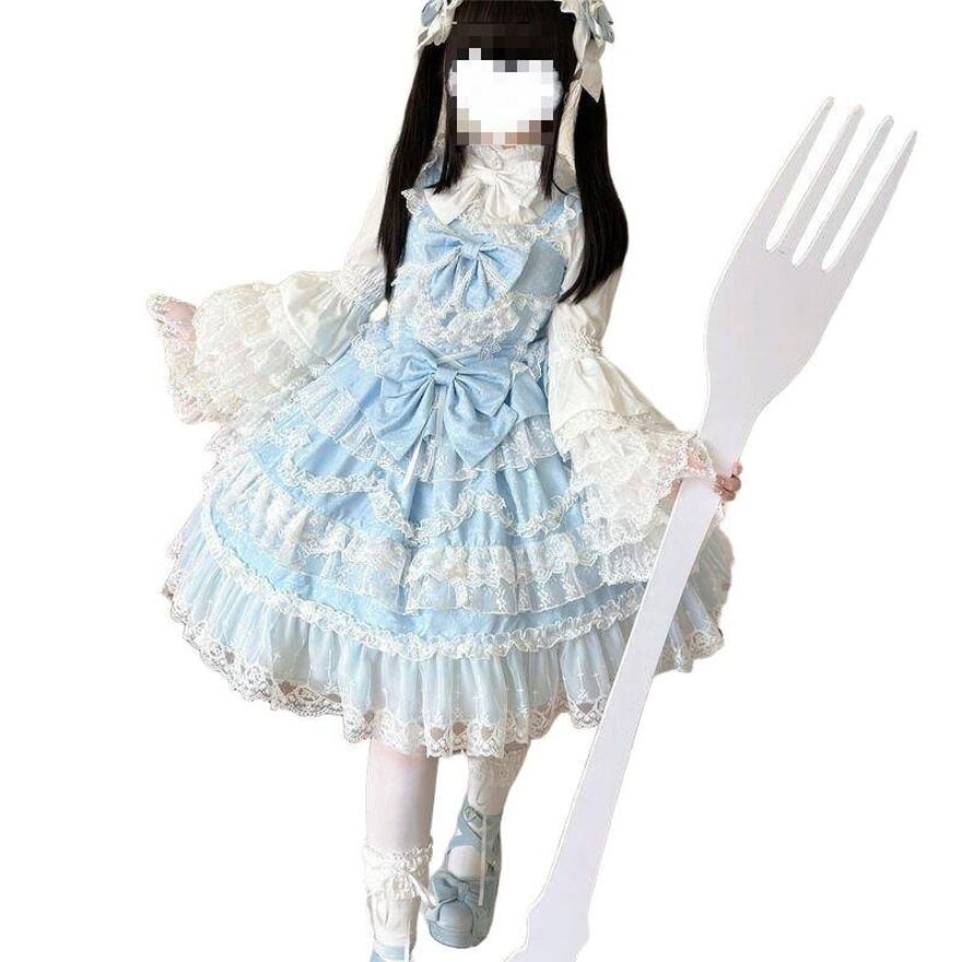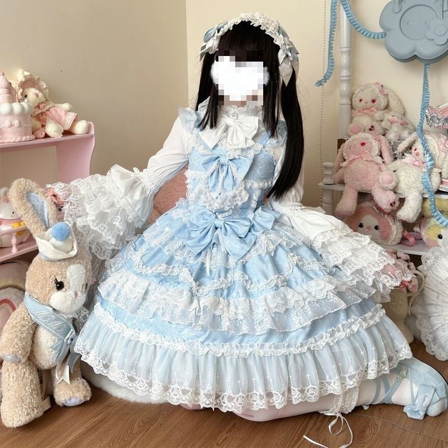 胸元の梯子レースや幾重にも重なる裾のフリルが、王道の甘ロリスタイルを完成させます。