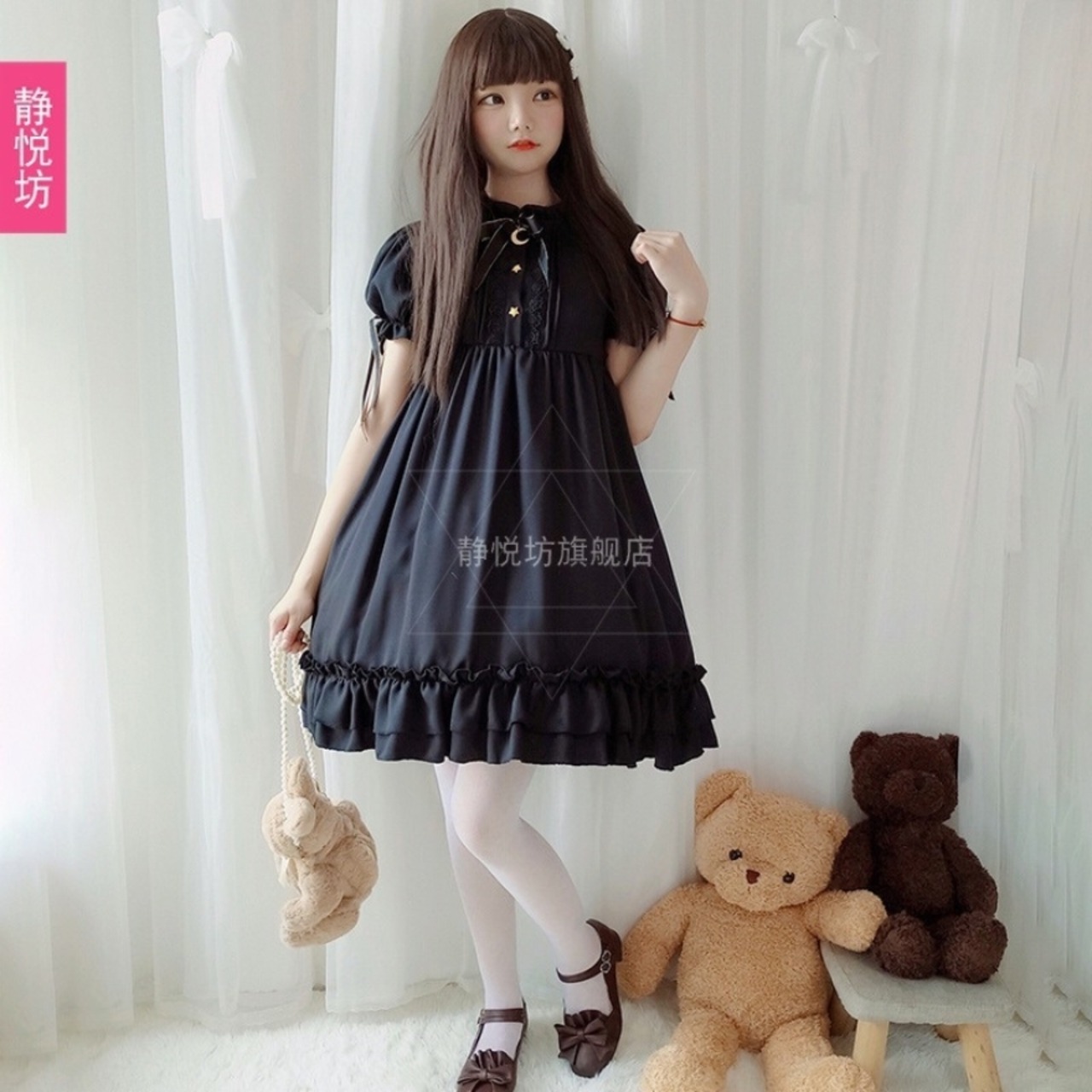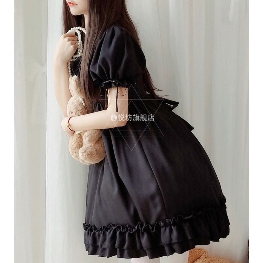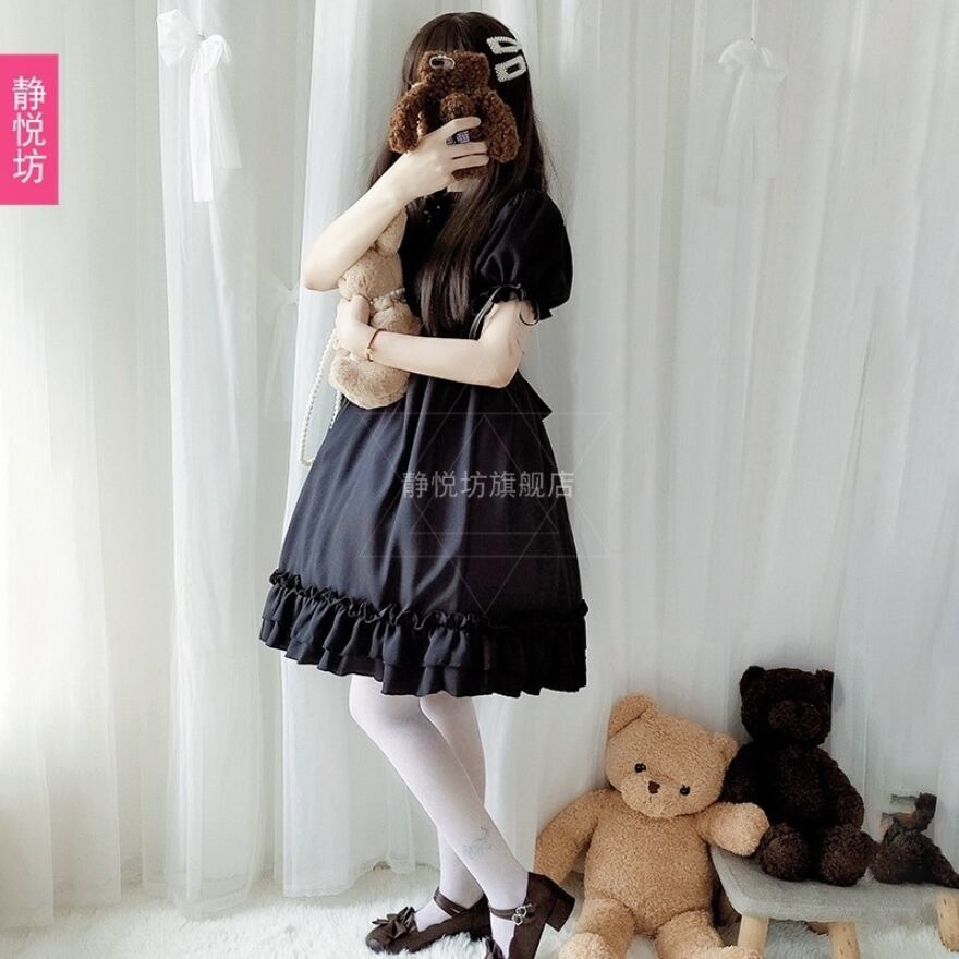 余計なものをそぎ落とした黒一色のワンピースなのに、フリルのスタンドカラーや胸元のレースプラケット、裾の二段フリルがしっかりとゴシックロリータの空気をつくっています。派手な装飾がないぶん、合わせるアクセサリーや小物によって自分らしさを出しやすく、着込むほどにコーデの幅が広がっていく一着です。パフスリーブのシルエットが全体に柔らかみをくわえていて、ゴシックの持つ深みと、どこか品のある可愛さが共存しています。
