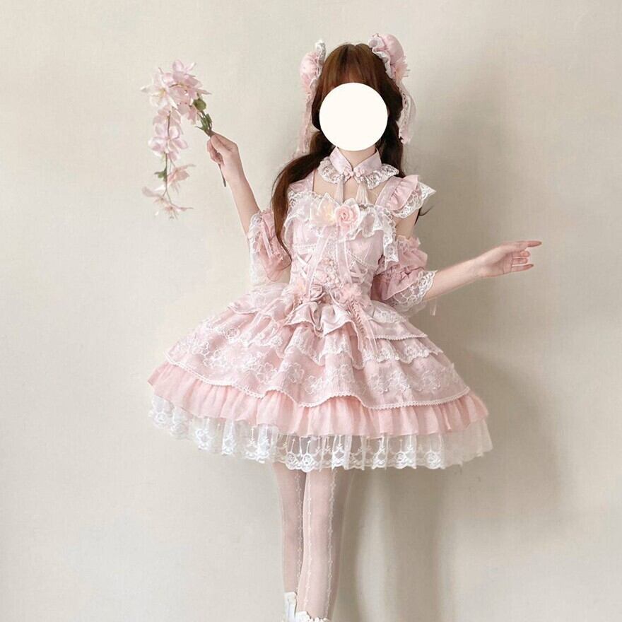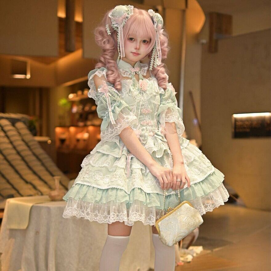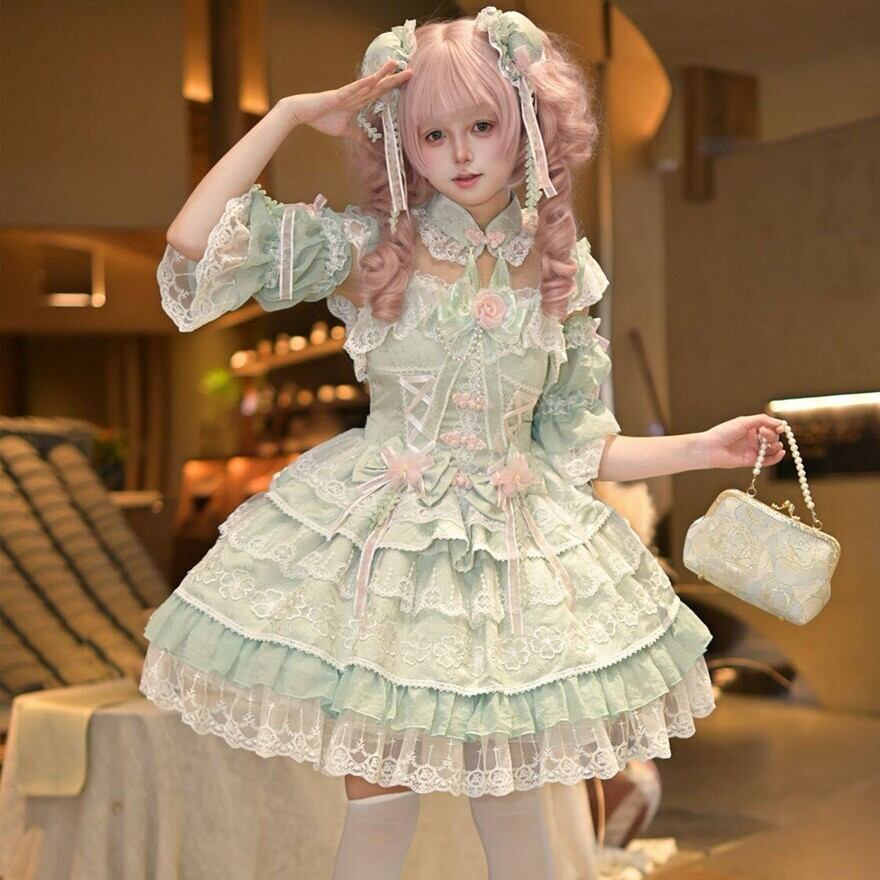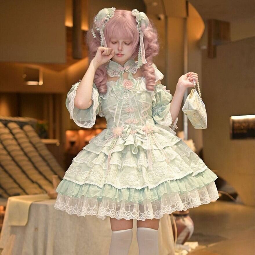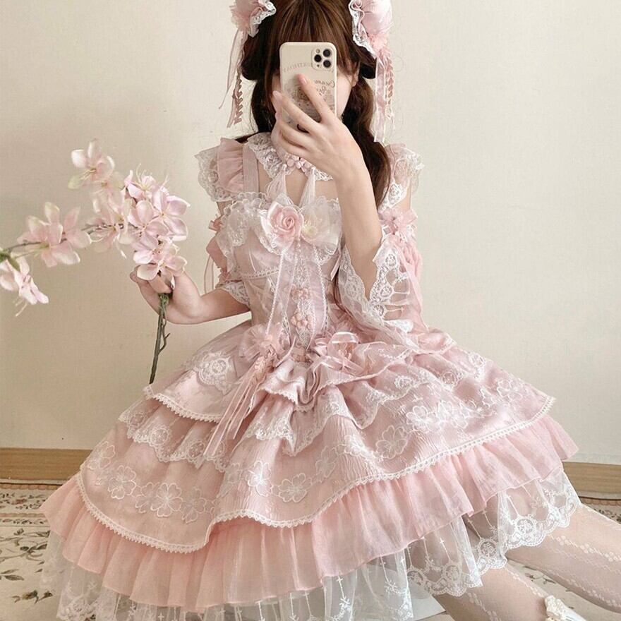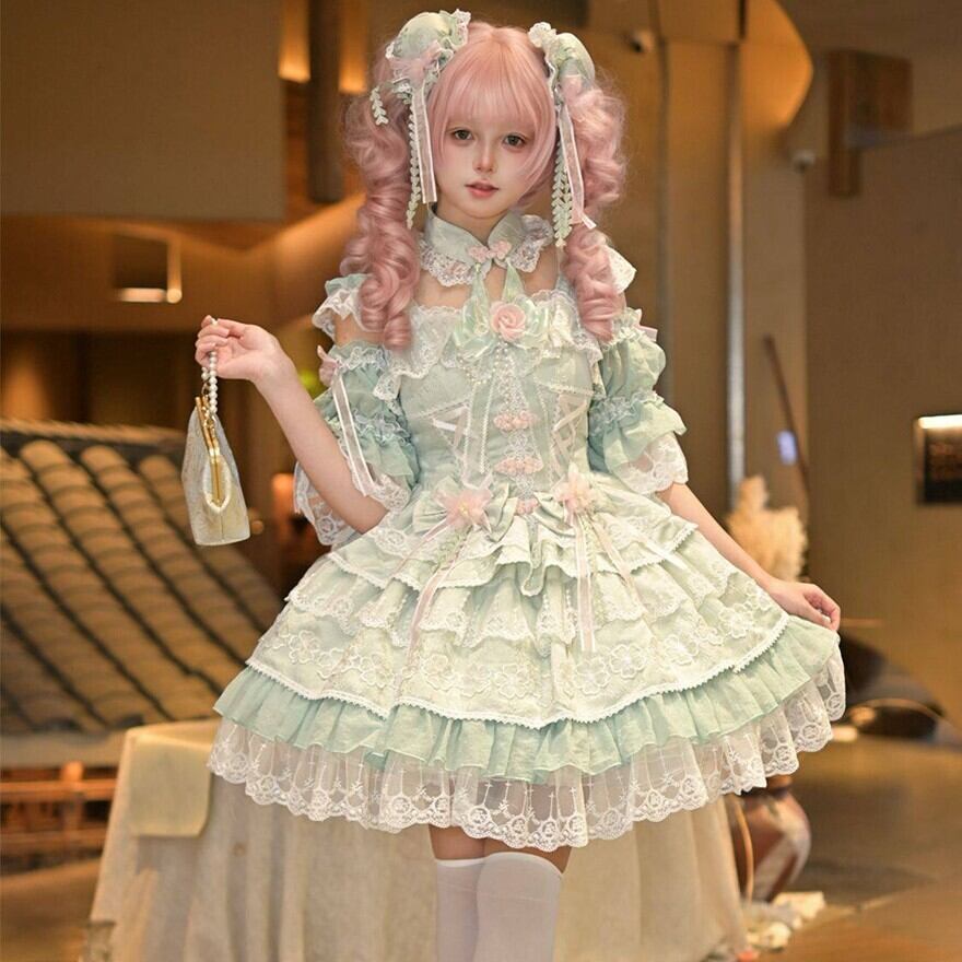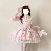ゴシックロリータのような暗色中心のデザインとは異なり、淡い配色とレース装飾が特徴の甘ロリ系ワンピースです。装飾は豊富ながら全体が統一されており、甘ロリ入門として取り入れやすい立ち位置です。