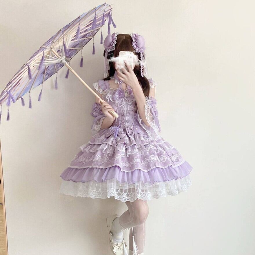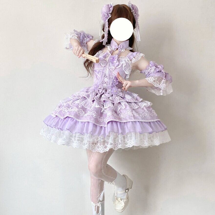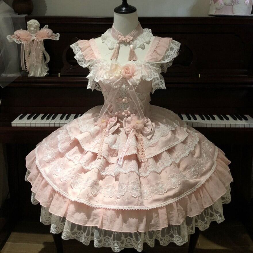 胸元のリボンや立体的な装飾、段状のスカート構造が確認できます。カラーは5色展開のため、好みに合わせて選びやすく、はじめてのロリータにも取り入れやすい一着です。