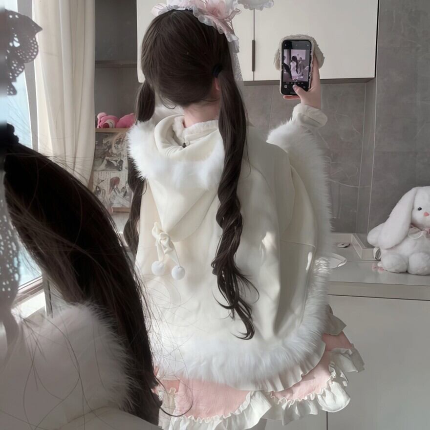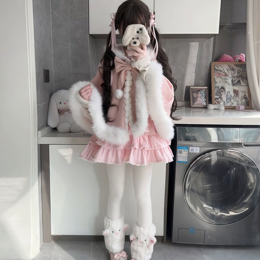 やわらかな色合いに、ふんわりとしたファーの縁取りが重なるケープタイプのアウターです。ゆったりと広がるシルエットと、胸元のポンポンリボンが甘ロリらしい愛らしさを引き立て、羽織るだけでコーデ全体に優しい空気感を添えてくれます。シンプルな装いに重ねるだけでも、ぐっと世界観がまとまる一着です。