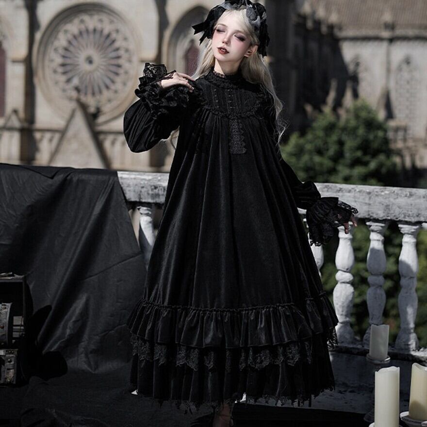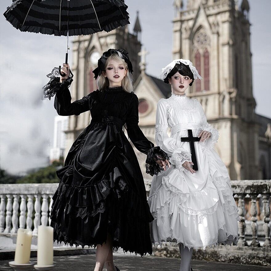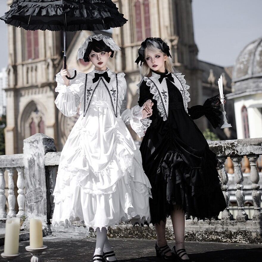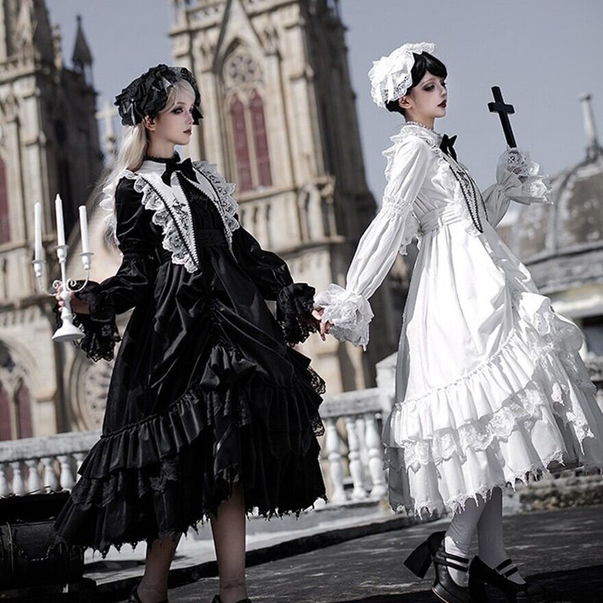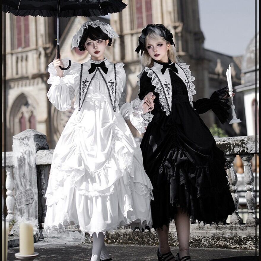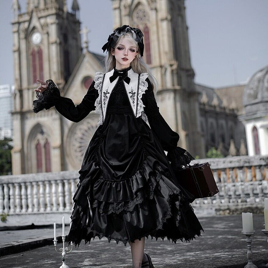 教会の影が落ちる石畳を、静かに歩きたくなるようなゴシックロリータの一着です。甘さを抑えたモノトーンの美しさが、可憐さと気高さをちょうどよいバランスでつないでくれます。