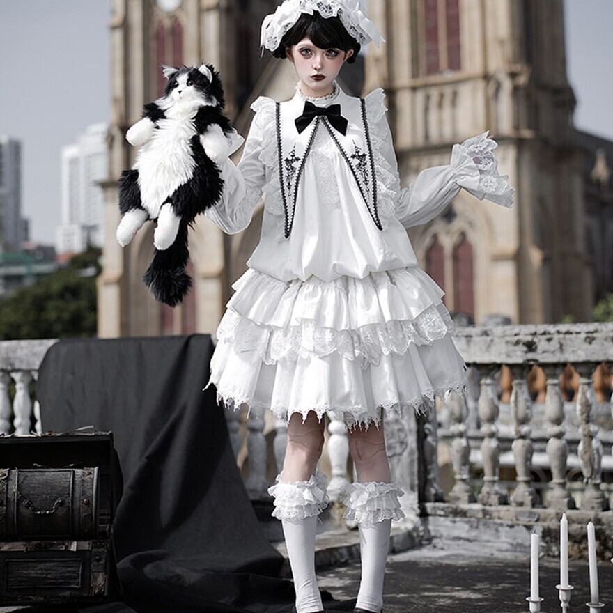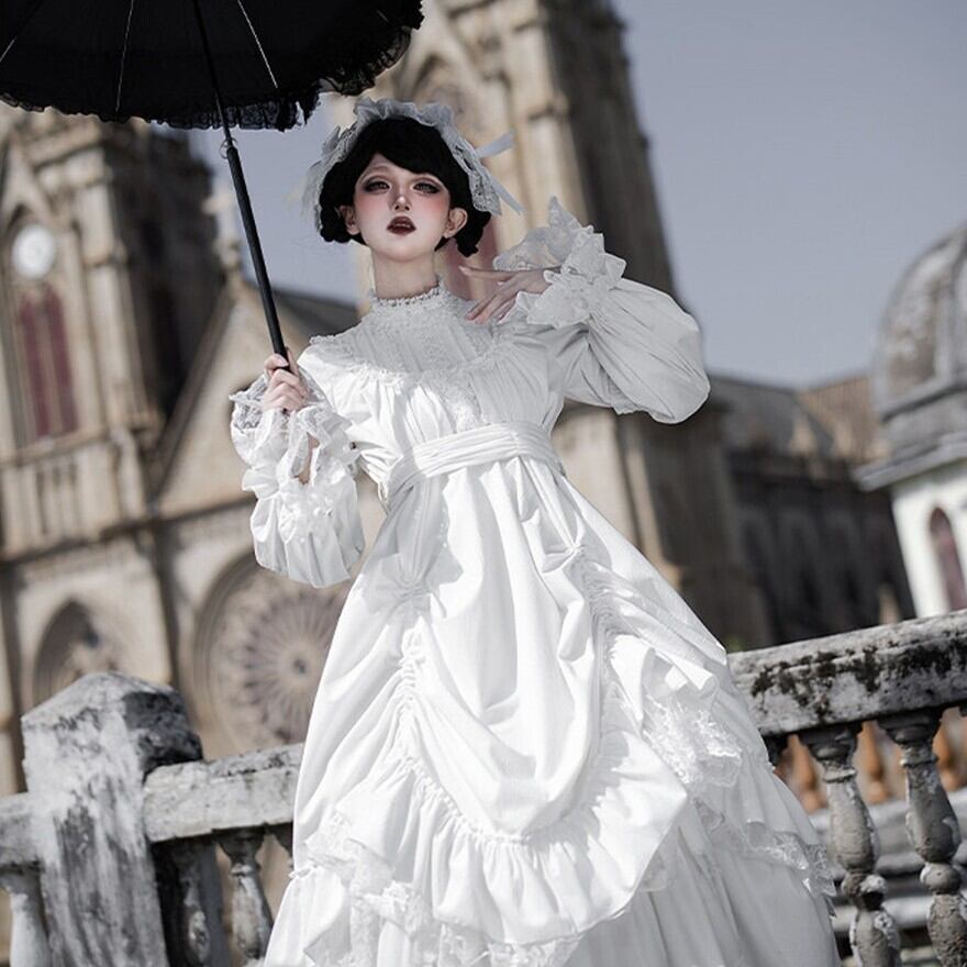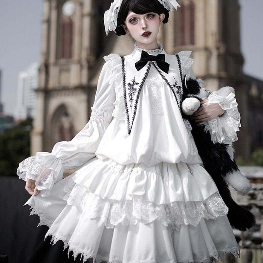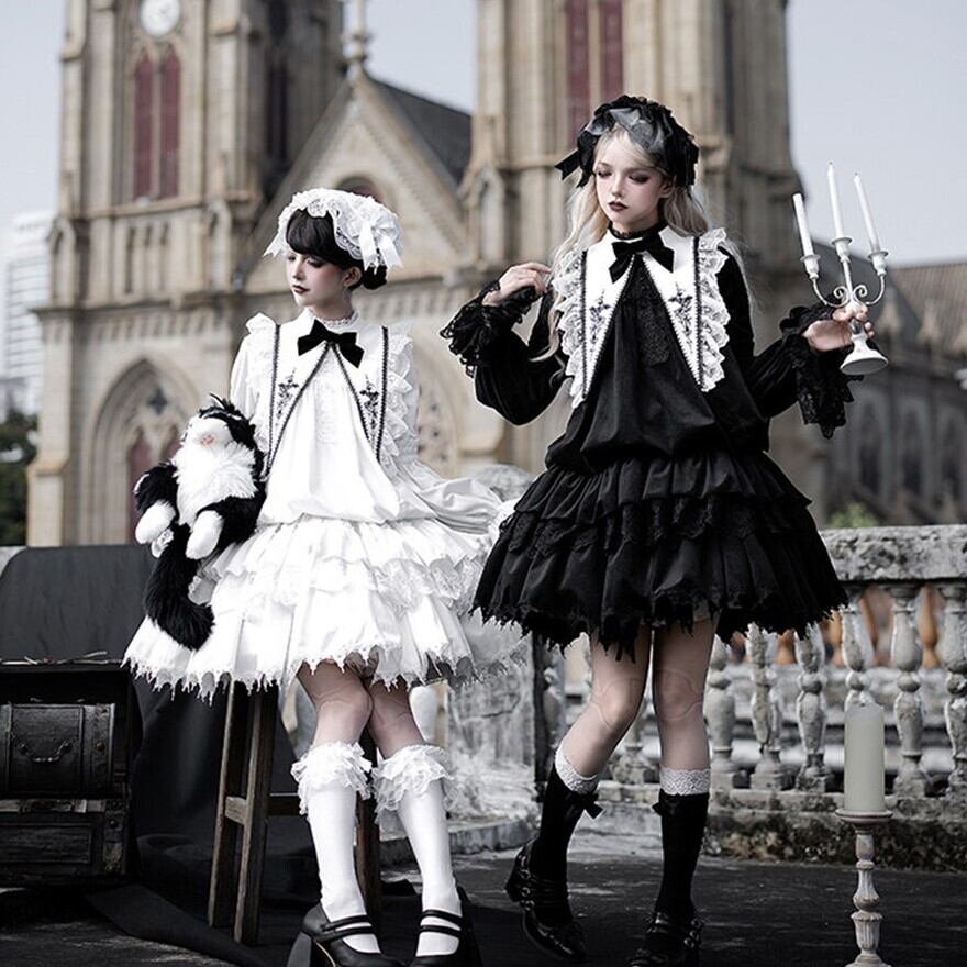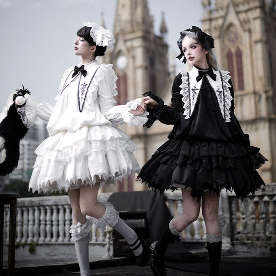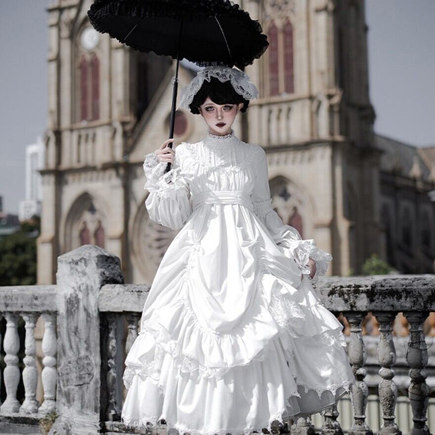 教会の影が落ちる石畳を、静かに歩きたくなるようなゴシックロリータの一着です。甘さを抑えたモノトーンの美しさが、可憐さと気高さをちょうどよいバランスでつないでくれます。