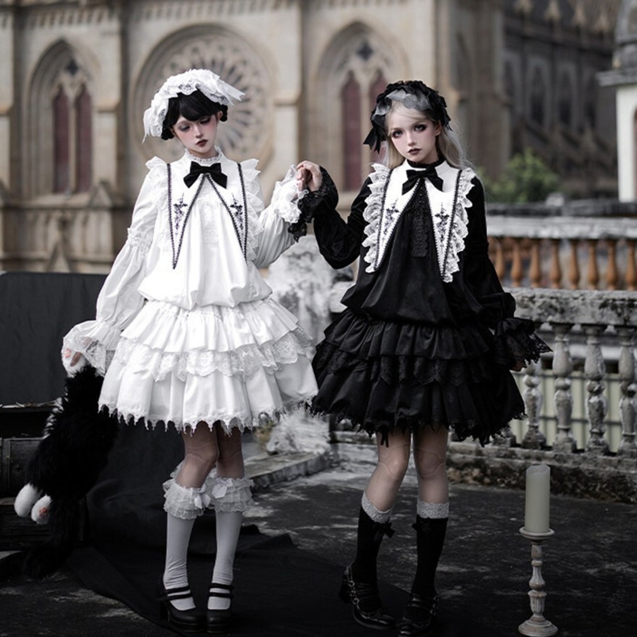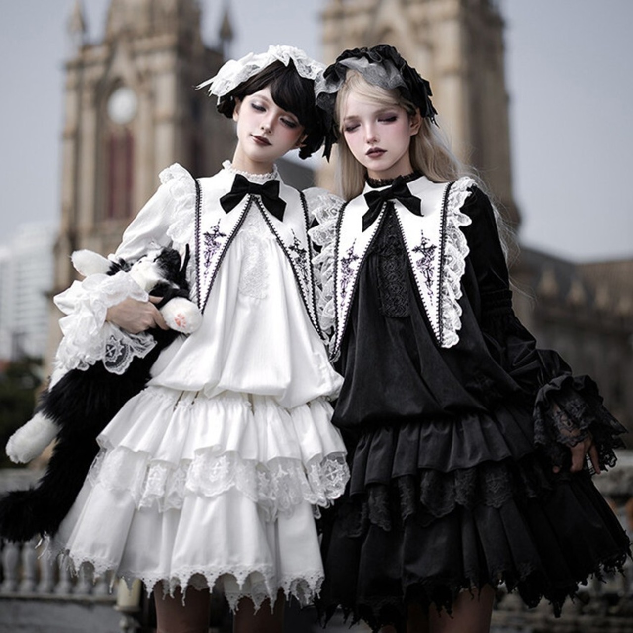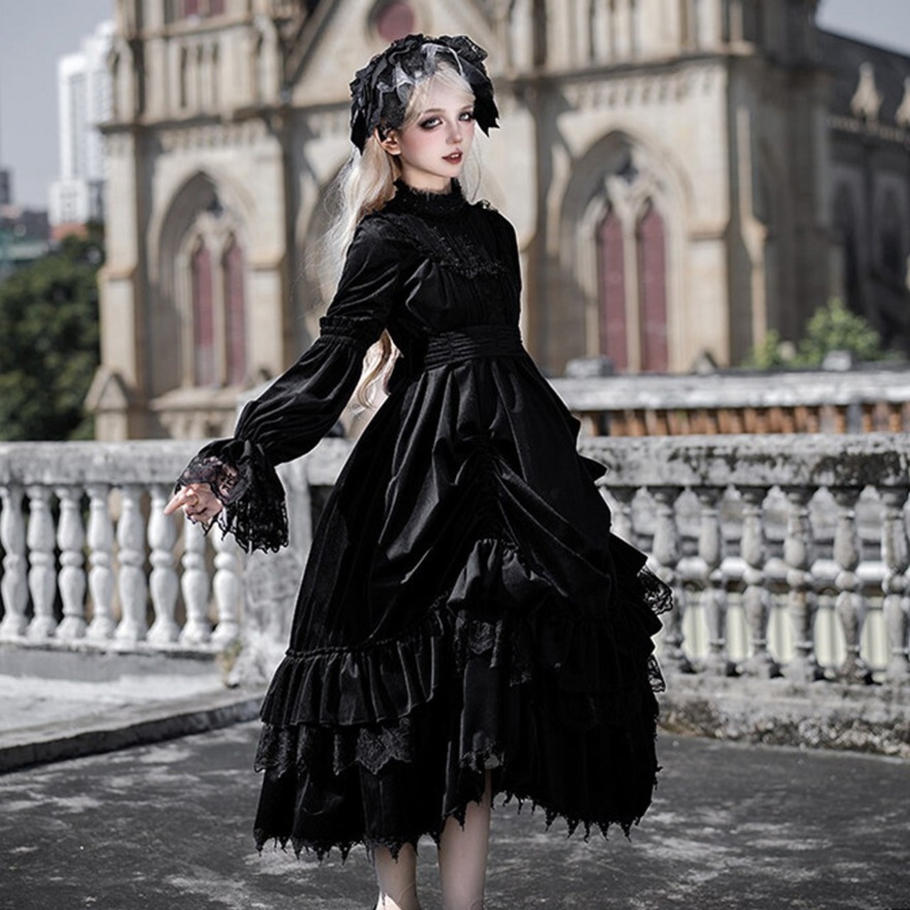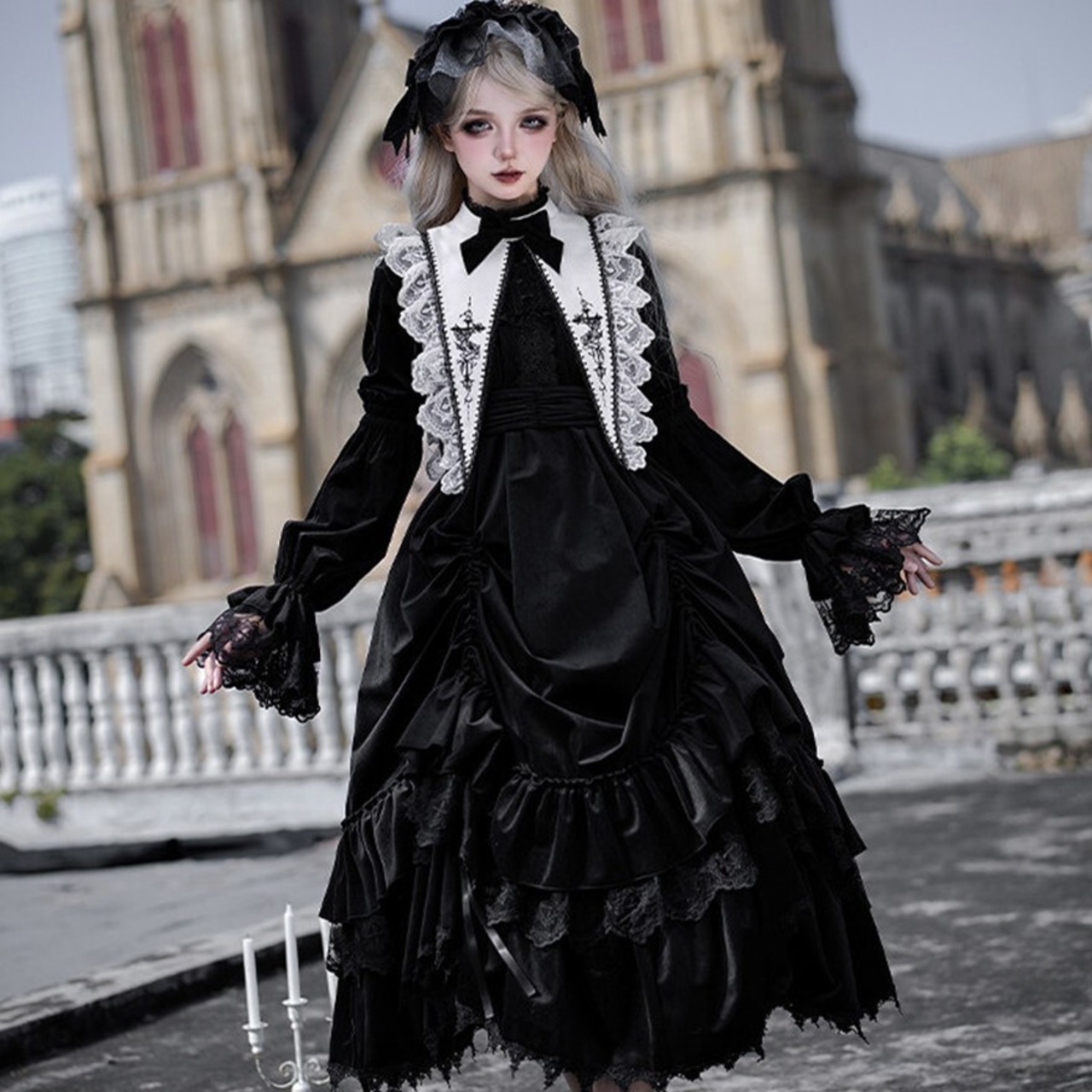 教会の影が落ちる石畳を、静かに歩きたくなるようなゴシックロリータの一着です。甘さを抑えたモノトーンの美しさが、可憐さと気高さをちょうどよいバランスでつないでくれます。