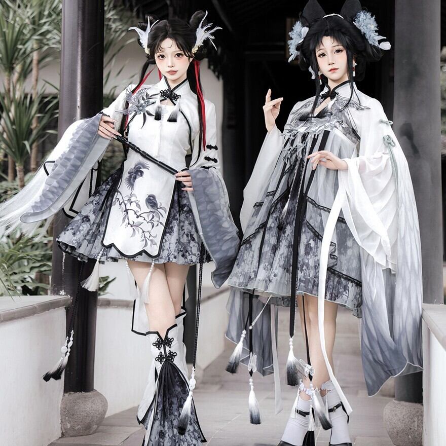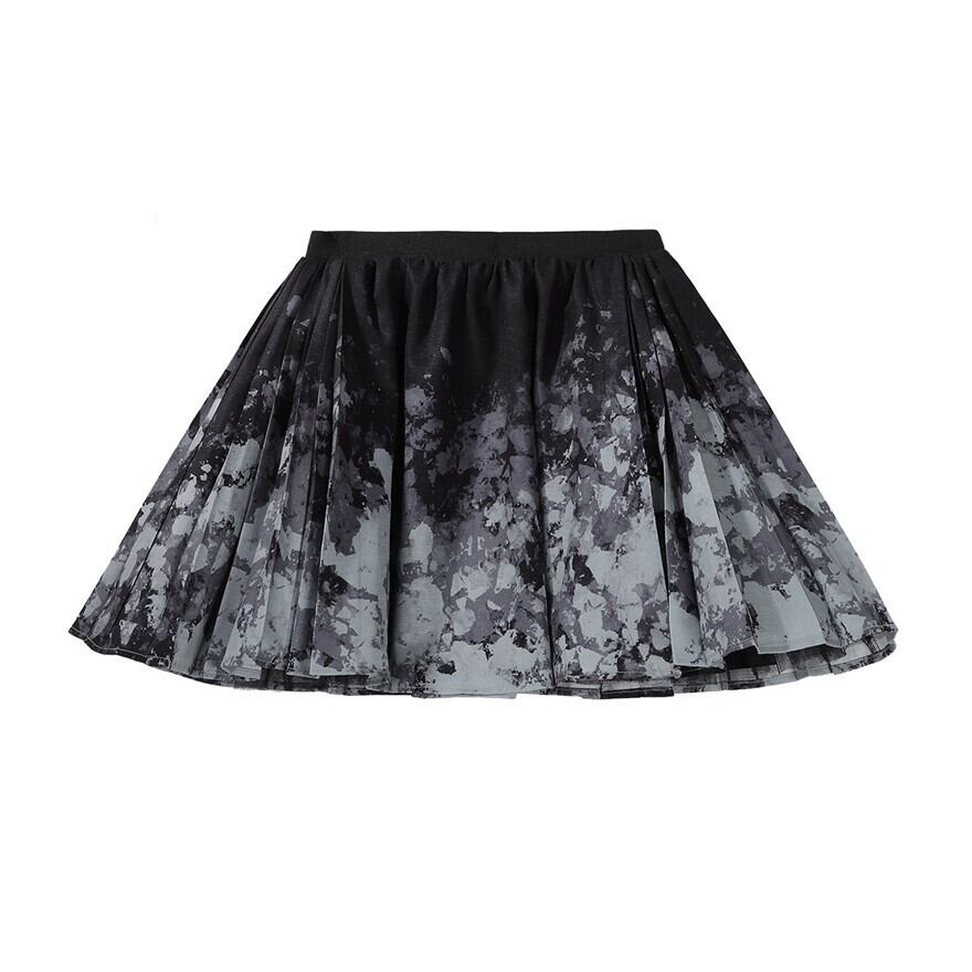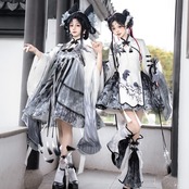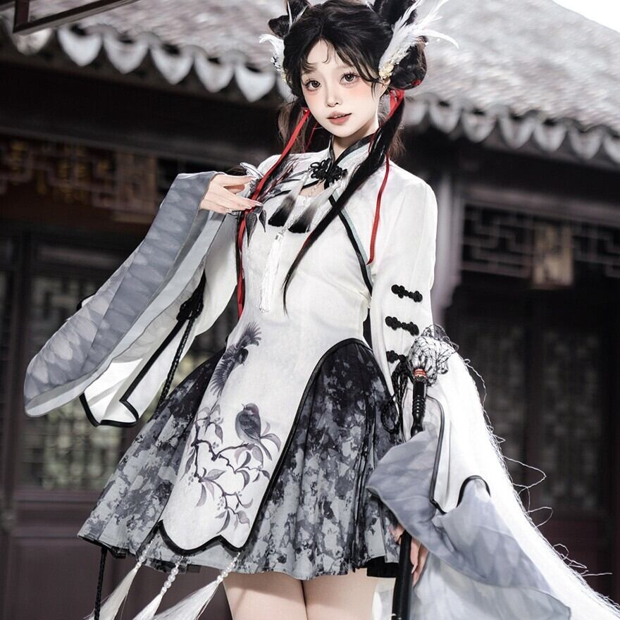 白を基調にグレーとブラックを重ねた、水墨柄の軽やかなミニセットアップです。広がる袖や揺れる飾り、脚もとのパーツまで統一感があり、短め丈でも幼く寄りすぎず印象的にまとまるのが魅力。動きのあるシルエットが写真に残りやすく、かわいさと少しの鋭さをどちらも楽しみたい日に選びたくなる一着です。