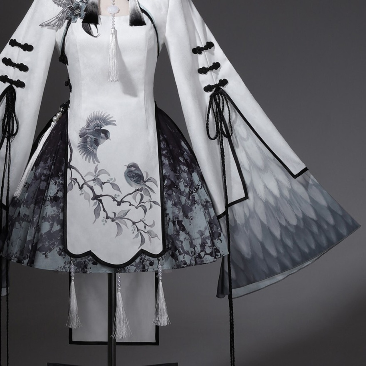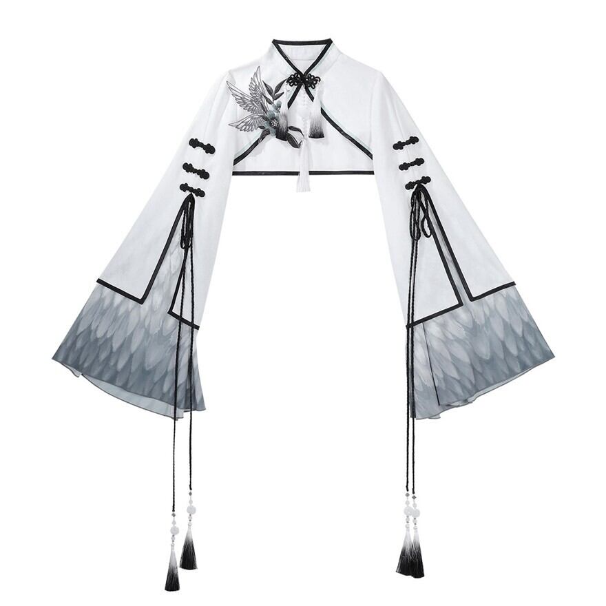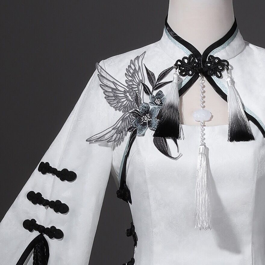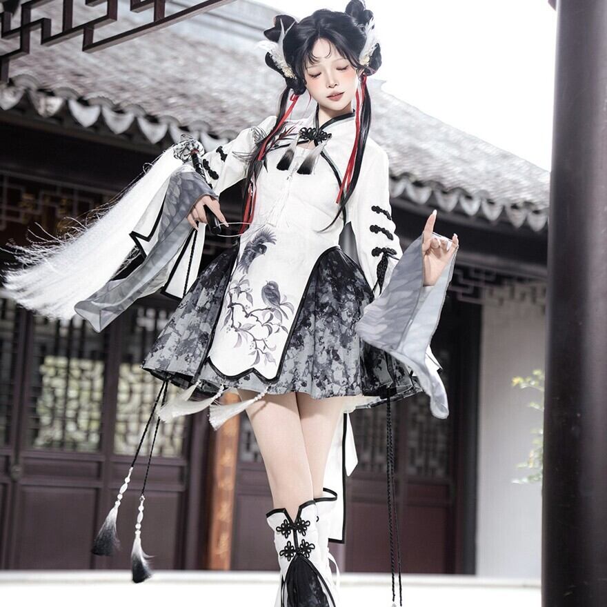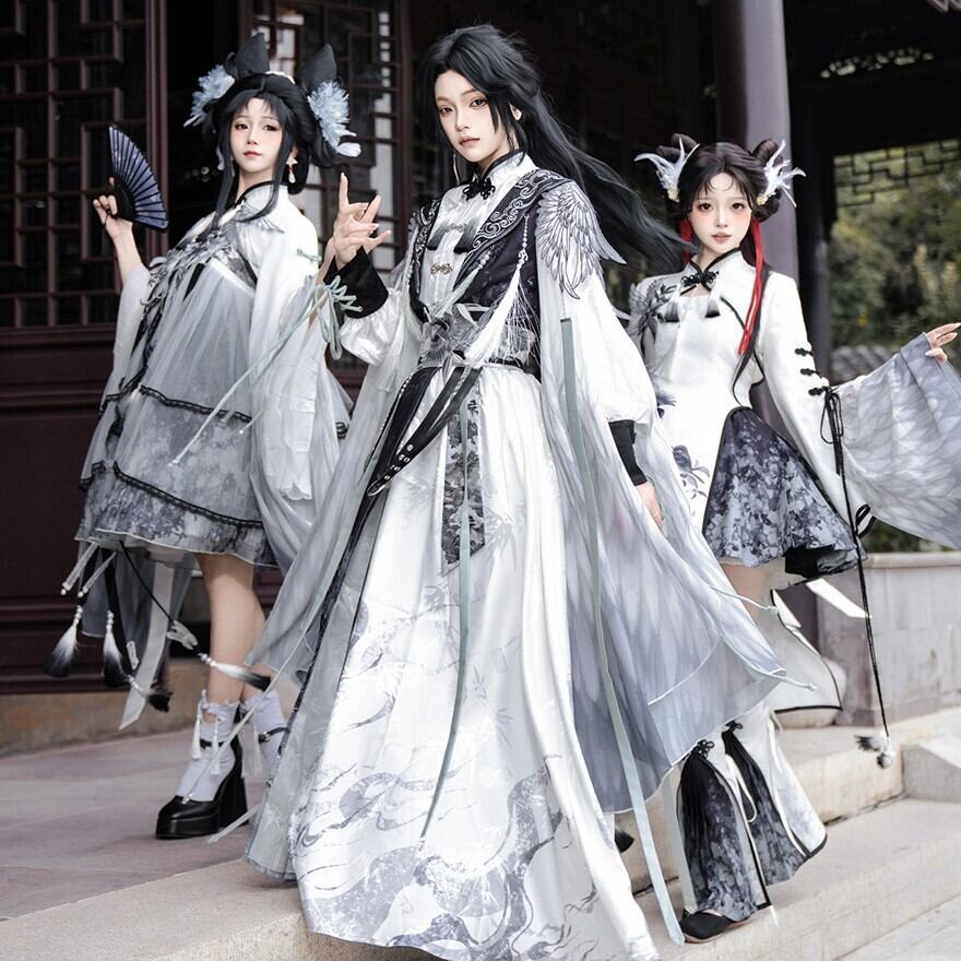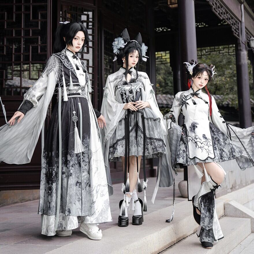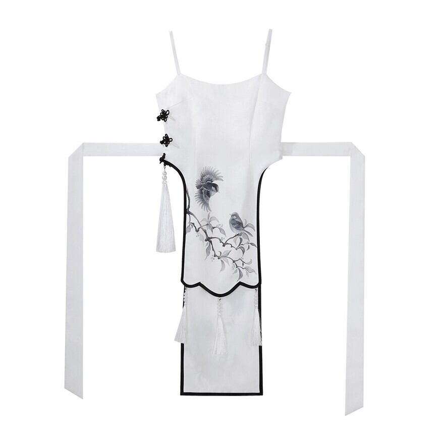 筆で描いた花影をまとって歩くような、軽やかで少し幻想的な世界観です。白を中心にした透明感のある配色が、和の気配と中華の装飾美をやわらかくつないでくれます。