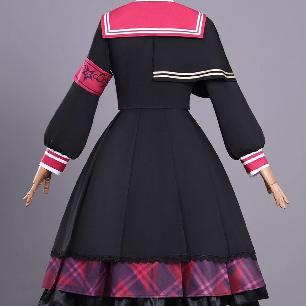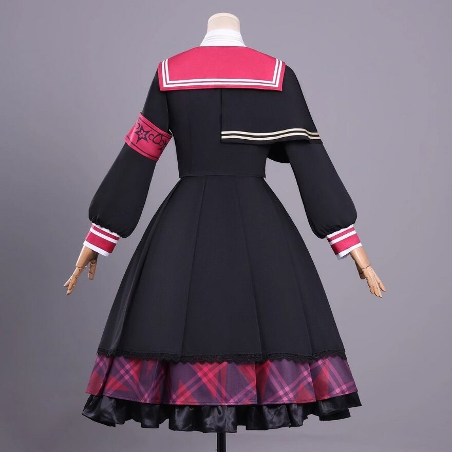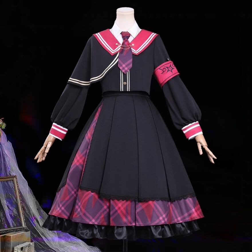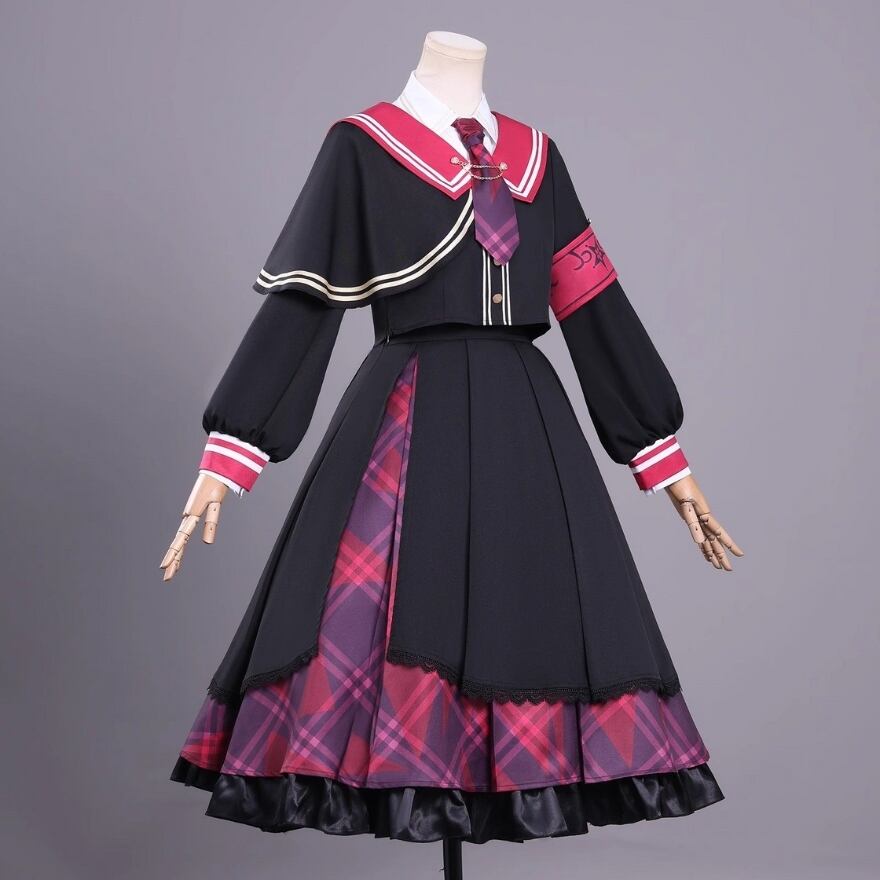 ブラックをベースに赤みのあるチェックを切り替えた、セーラーデザインのセットアップです。大きめの襟やネクタイ、チェーン飾りが視線を引きつけながら、全体はきれいにまとまっていて一着で世界観が完成しやすいのが魅力。少しダークで少し可愛い、その絶妙なバランスがあり、物語性のあるコーデを楽しみたい日にぴったりの存在感です。