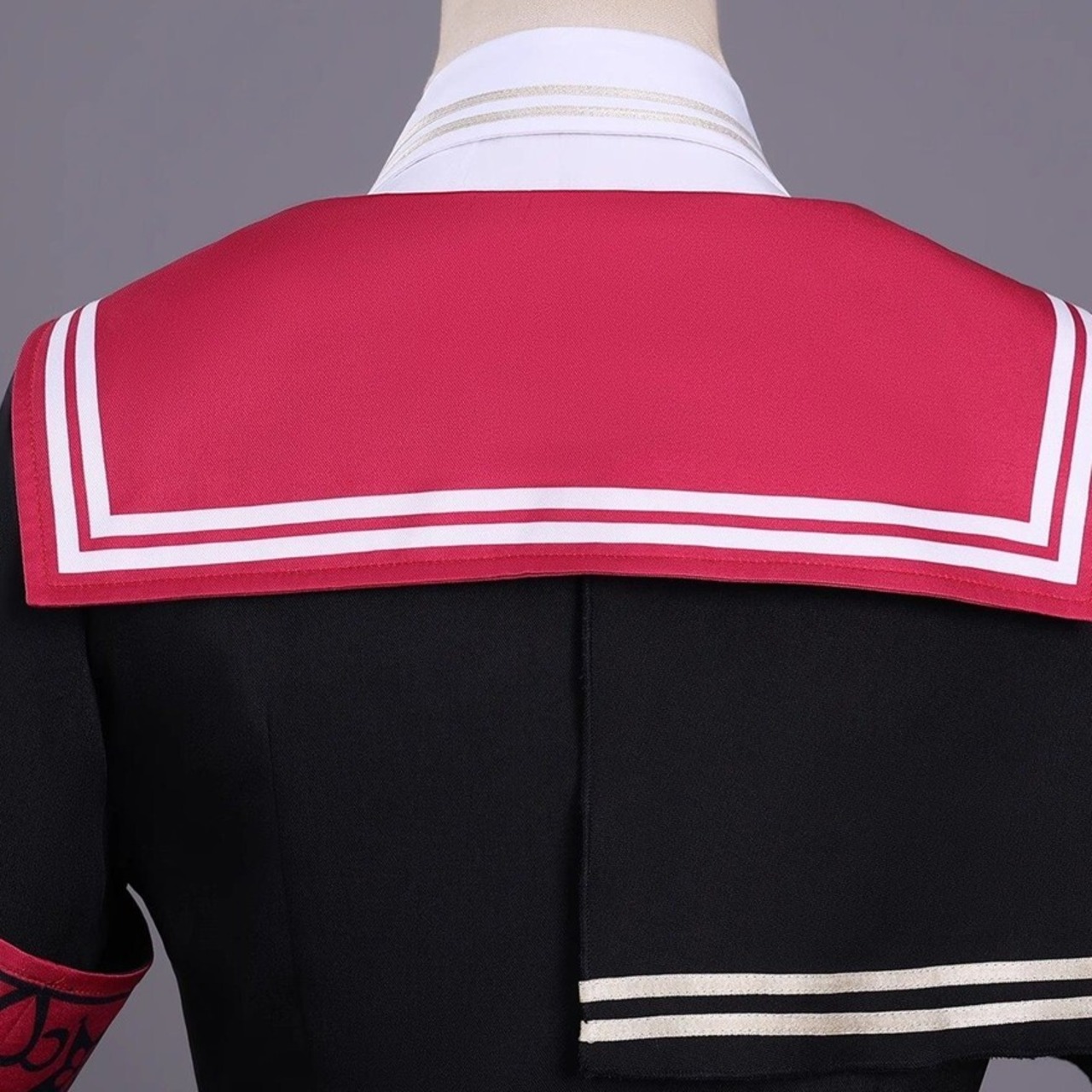 襟元:大きめのセーラーカラーとネクタイで、視線を集める上半身を演出
