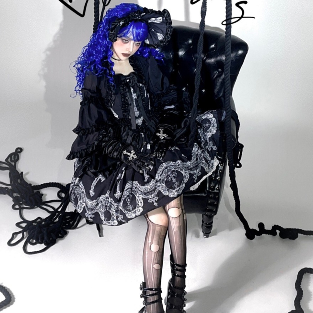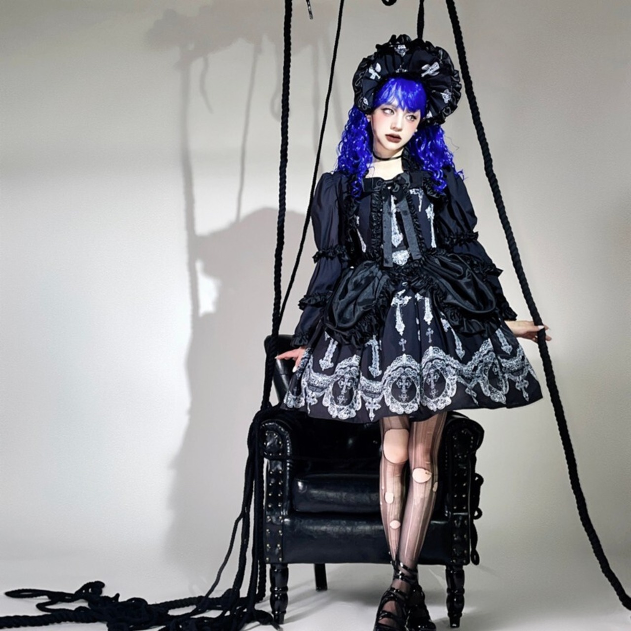 ボンネットは、ゴシックの扉を開く小さな冠。フリルの陰影と刺繍が、横顔をいっそう印象的に仕上げます。