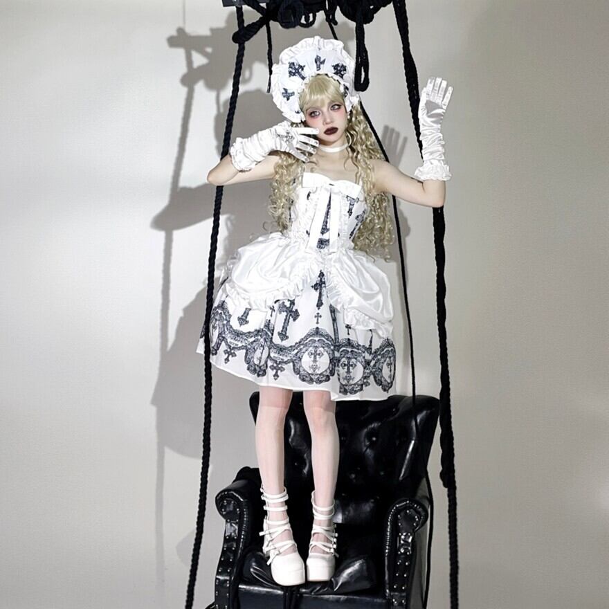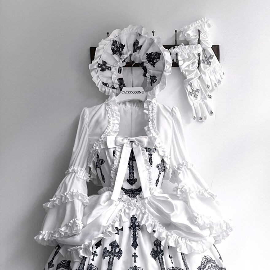 フリルと十字架刺繍を添えたボンネットで、顔まわりに物語を。リボンで結ぶ仕様なのでフィット感を調整しやすく、コーデの完成度を一段上げてくれます。