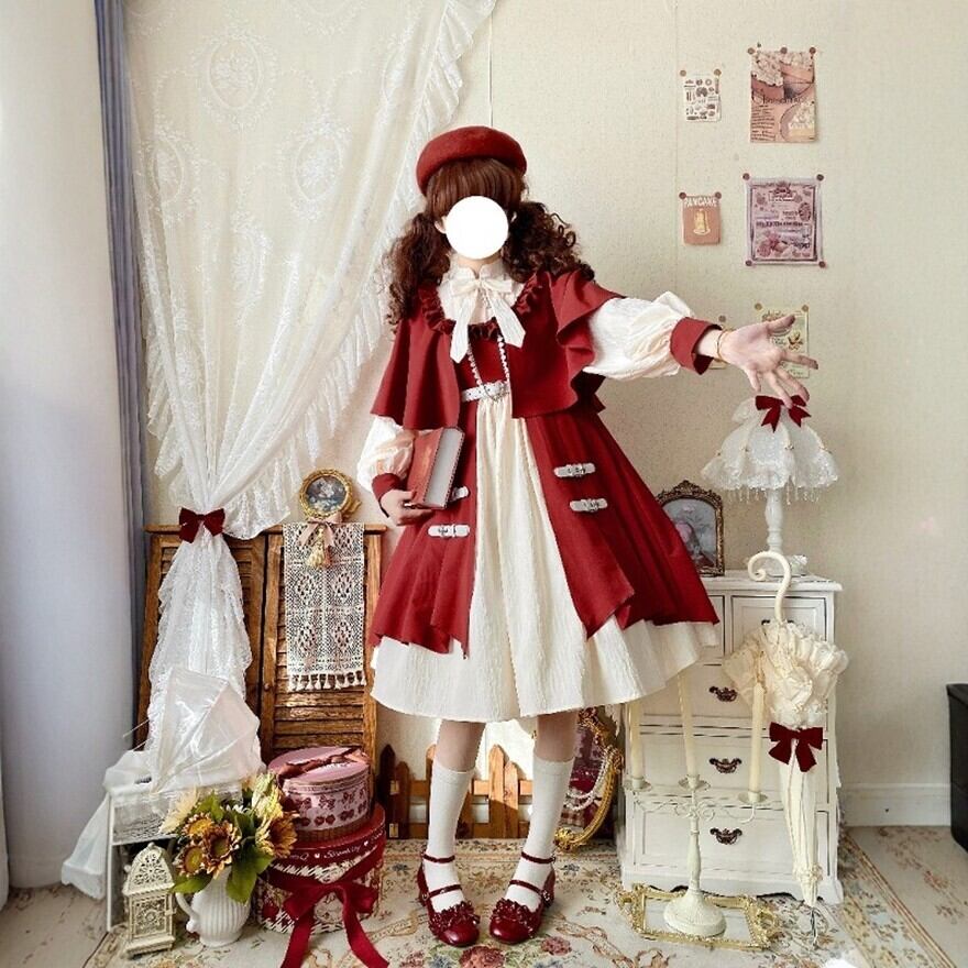 ケープを羽織ったようなシルエットが愛らしい、フェイクツーピースのクラシカルOP。ワインレッドとダスティブルーの2色で、お茶会にも日常のおでかけにも寄り添います。