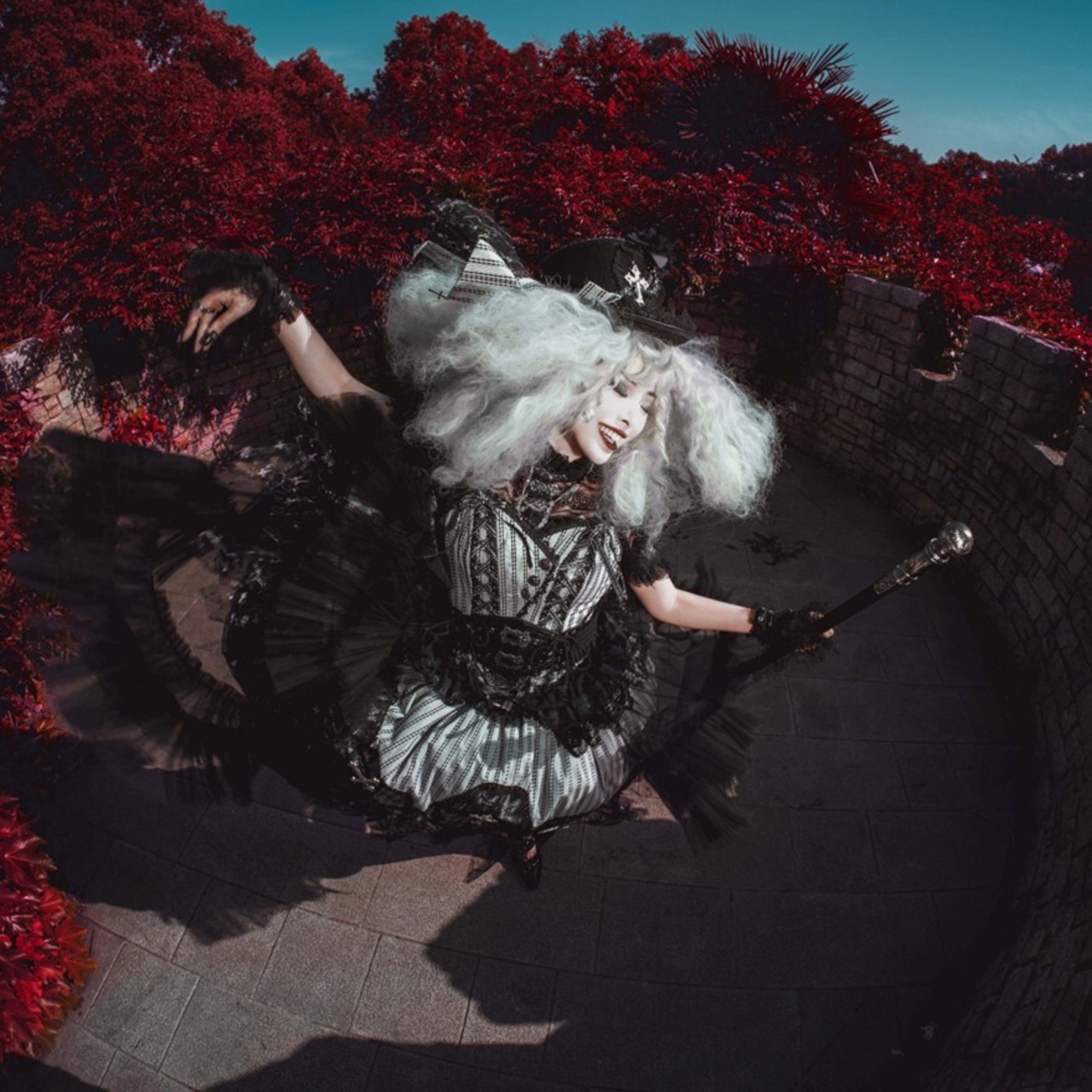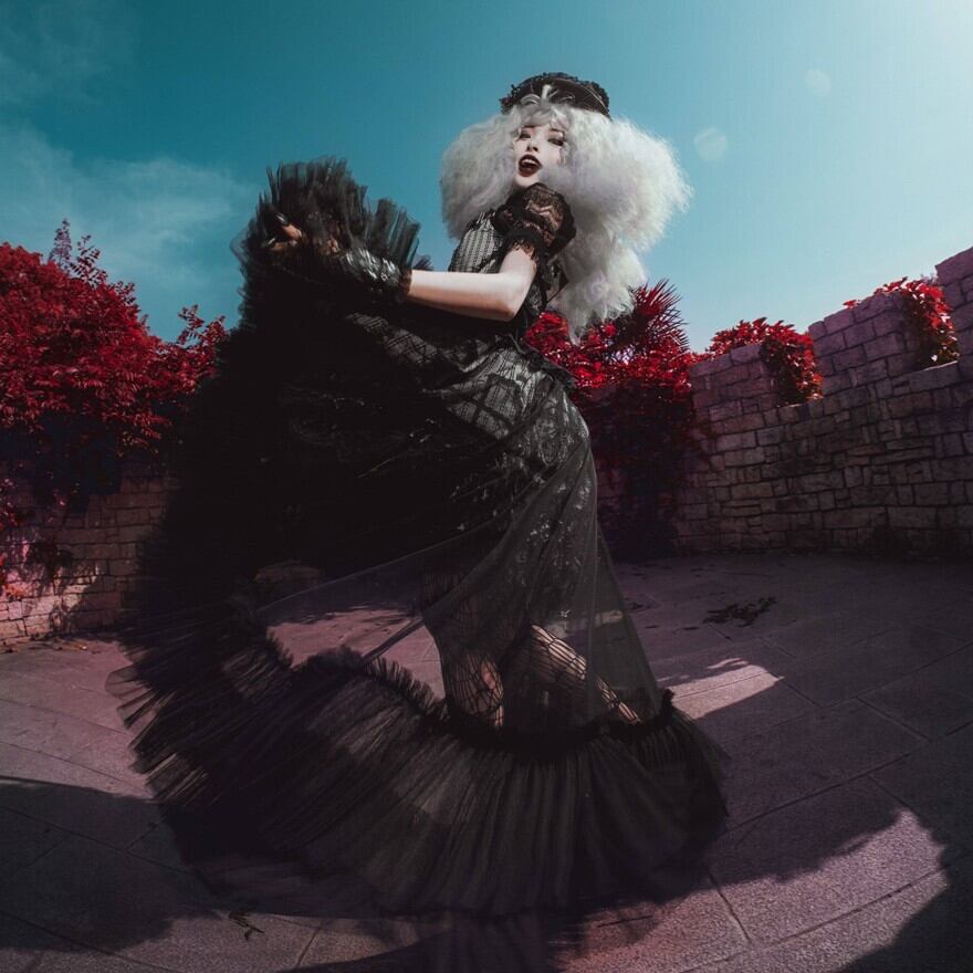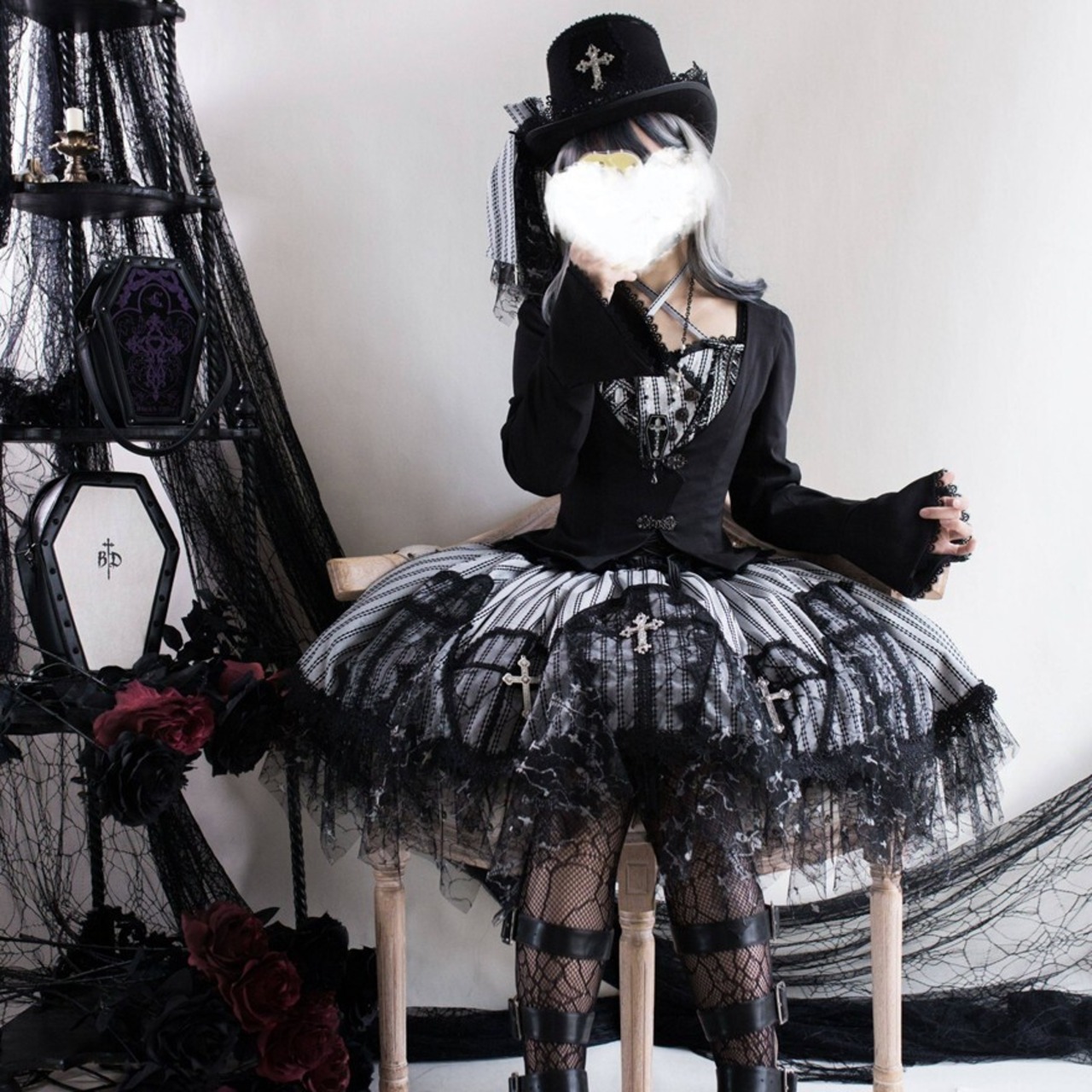 白と黒のコントラストに、ヴェールのようなレースの影が重なる静かな退廃。可憐さの中に棘を忍ばせた、夜更けの物語です。
