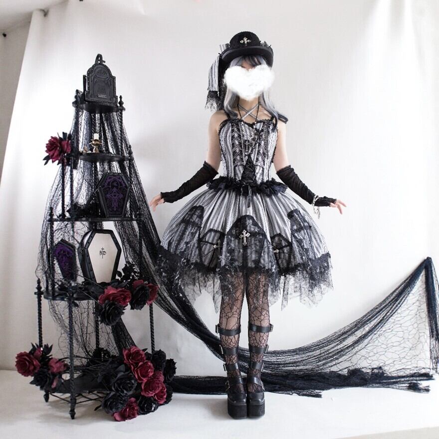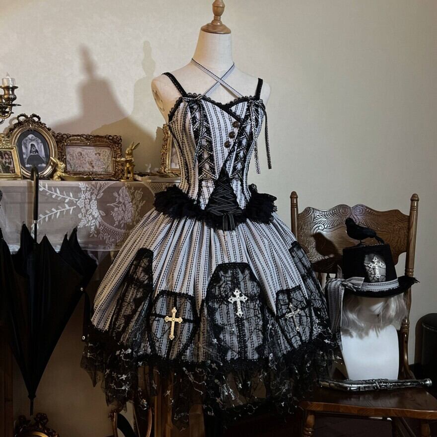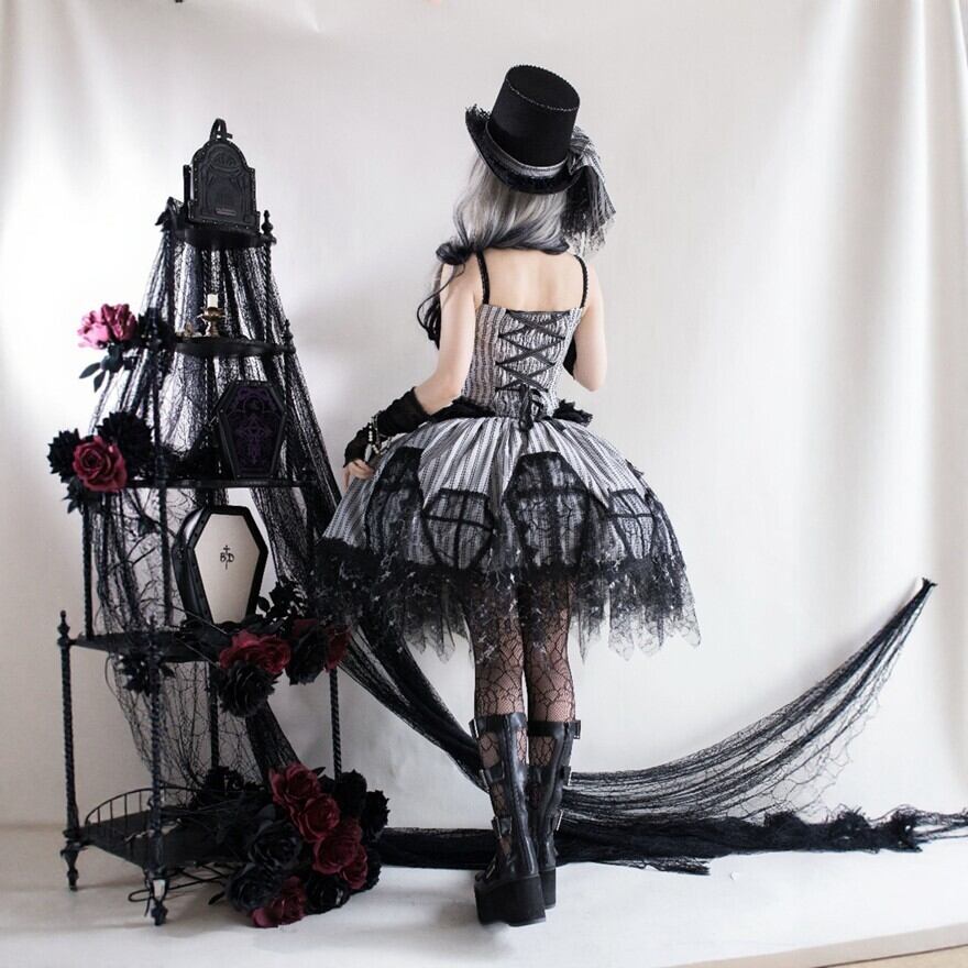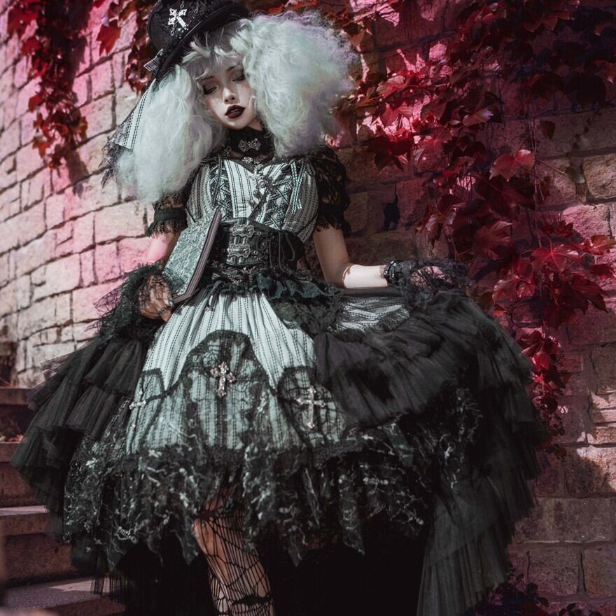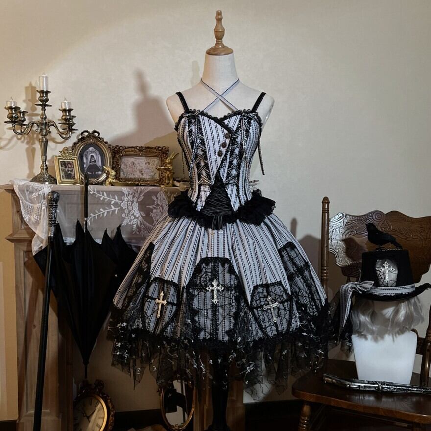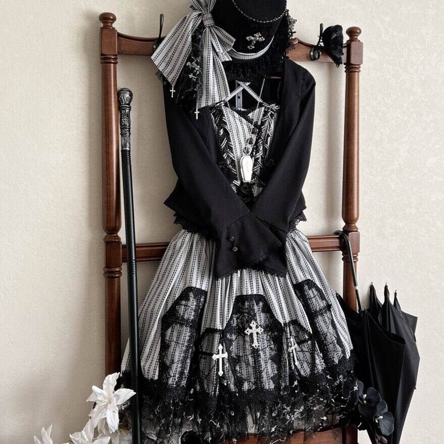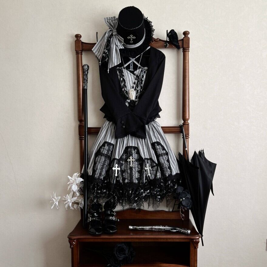 黒レースを重ねたストライプのジャンスカが、甘さよりも“美しさ”を選びたい気分に寄り添う一着。コルセット風の編み上げと揺れる裾が、立つだけでシルエットを完成させます。小物次第で、クラシカルにもダークにも表情が変わります。