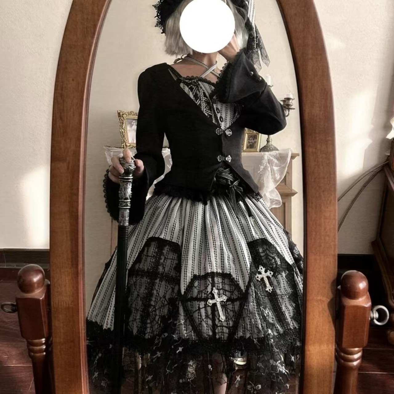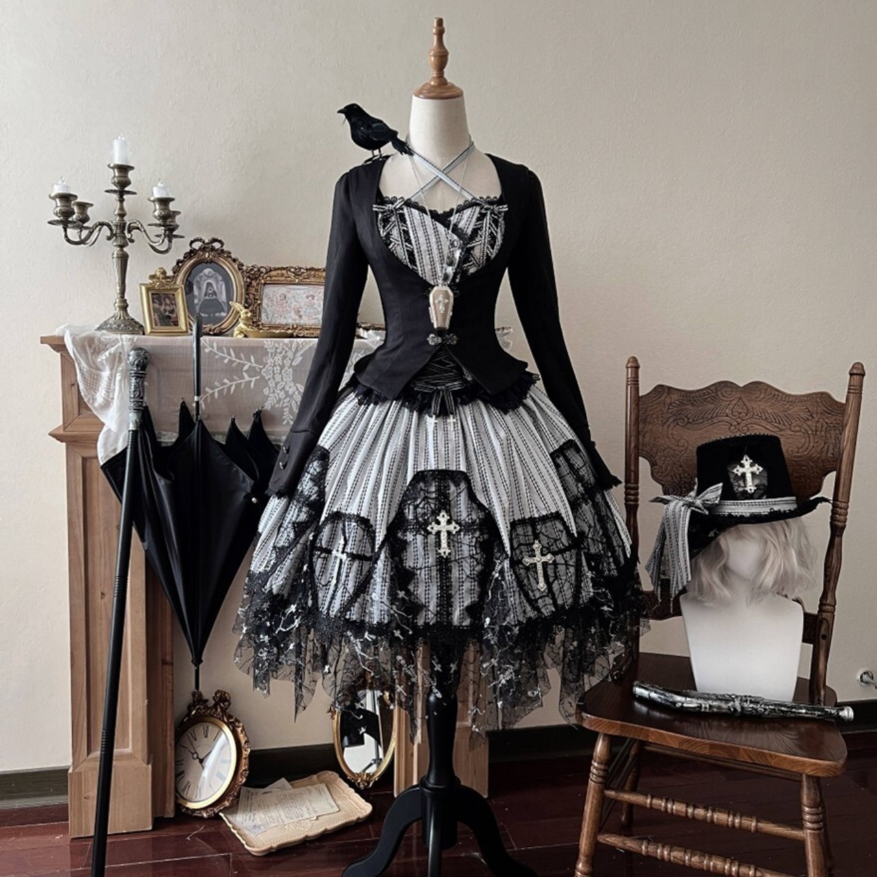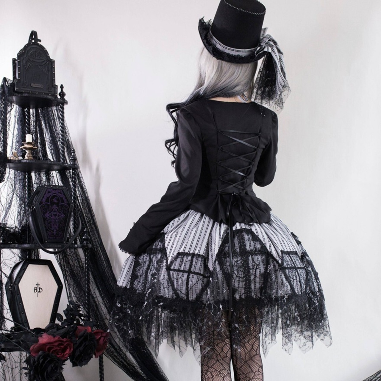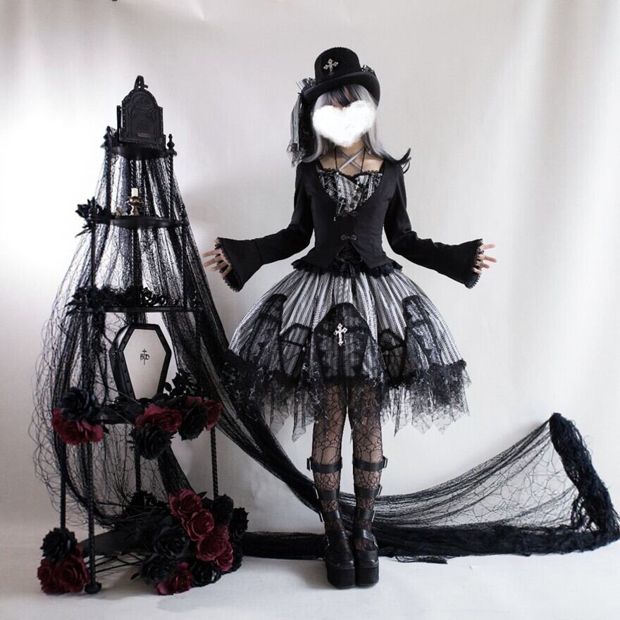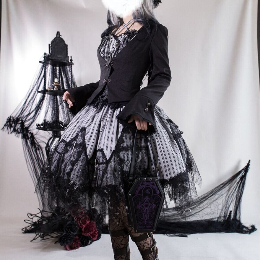 黒レースを重ねたストライプのジャンスカが、甘さよりも“美しさ”を選びたい気分に寄り添う一着。コルセット風の編み上げと揺れる裾が、立つだけでシルエットを完成させます。小物次第で、クラシカルにもダークにも表情が変わります。