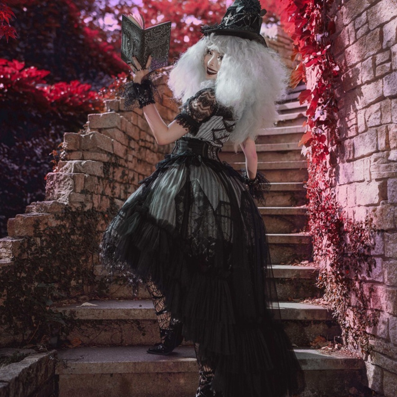 撮影会やイベントに。黒小物でまとめると、レースの陰影がより引き立ちます。