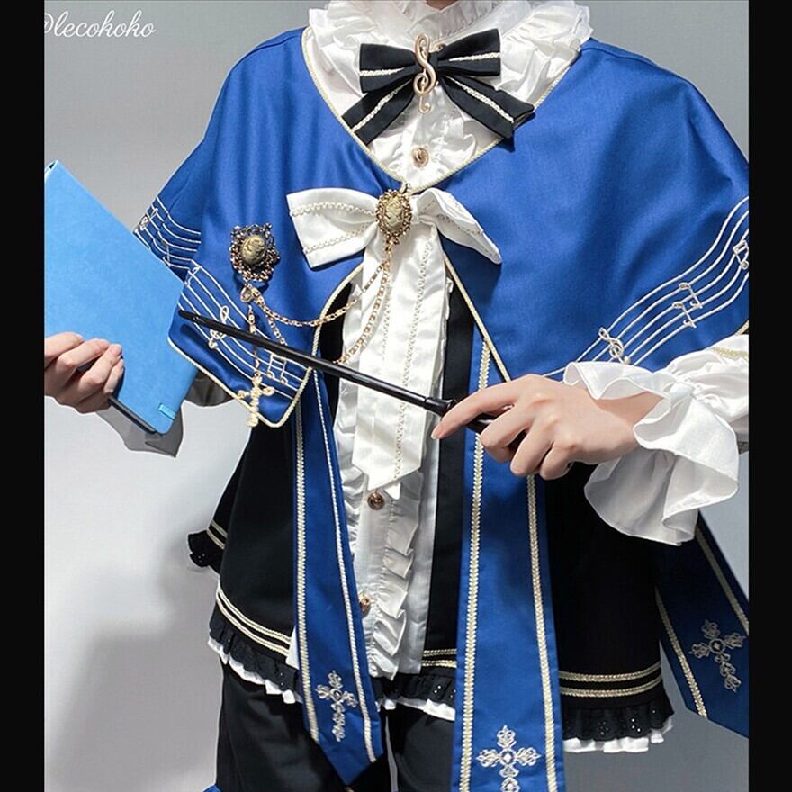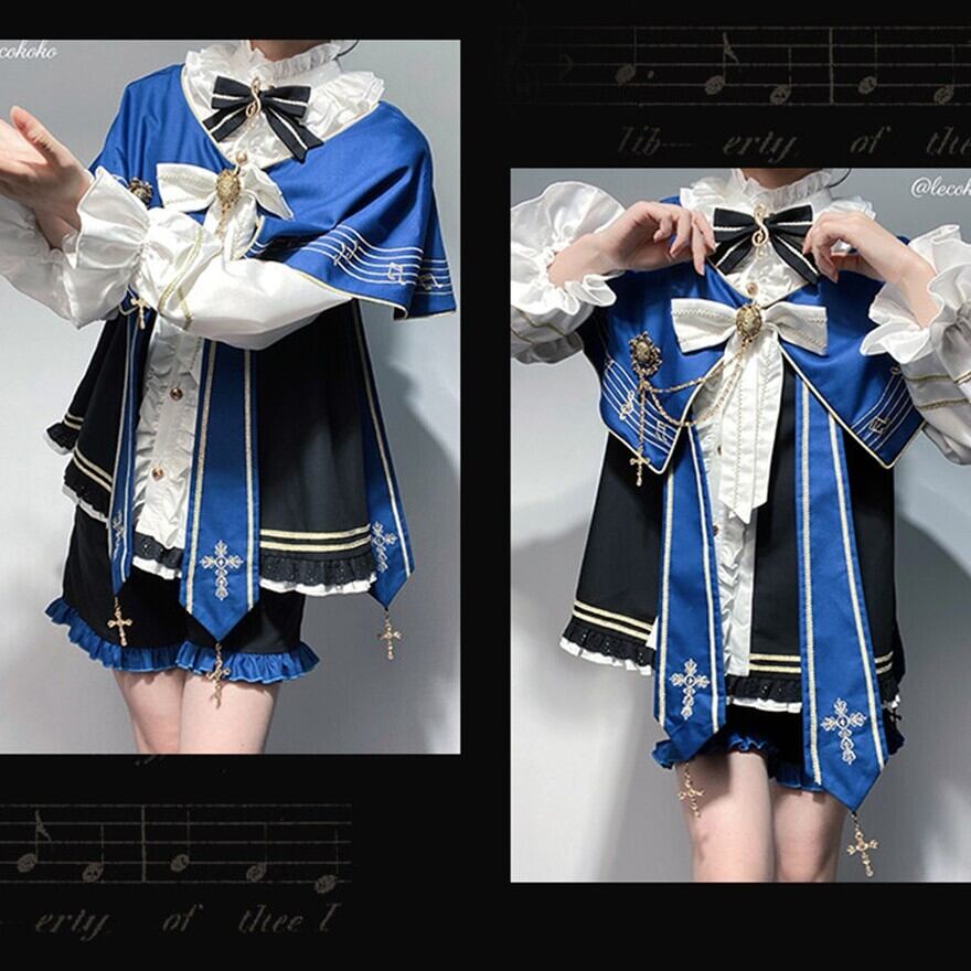 聖歌隊を思わせるケープを重ねた、王子系ロリータのセットアップです。白フリルの縦ラインと大きなリボンが視線を集め、きちんとした端正さの中に、物語の華やかさが残る仕立て。ケープの揺れと配色が、立ち姿まで綺麗に見せてくれます。