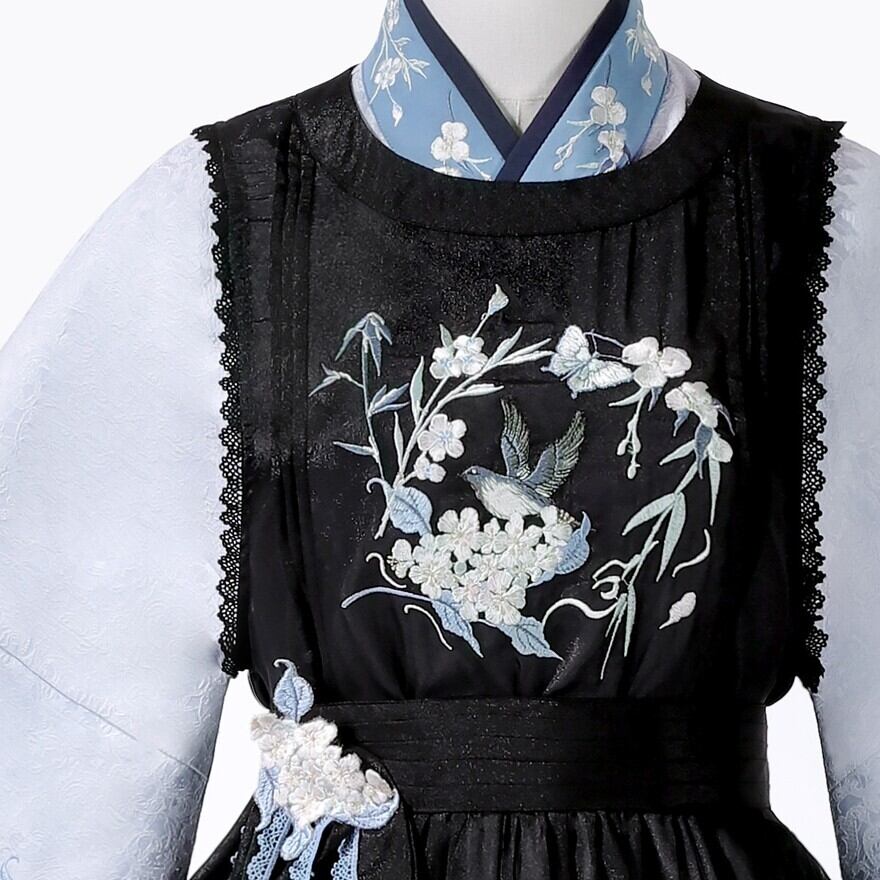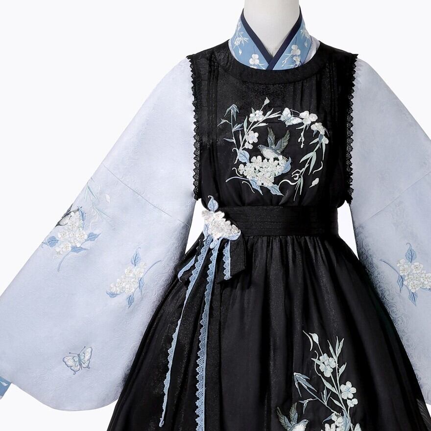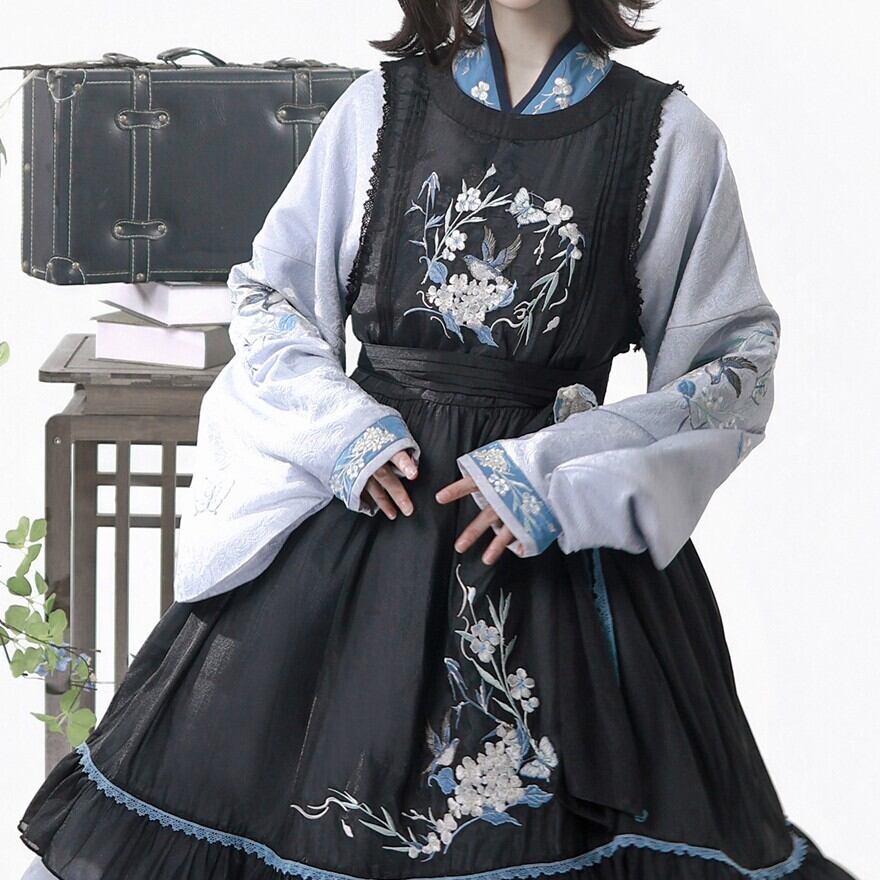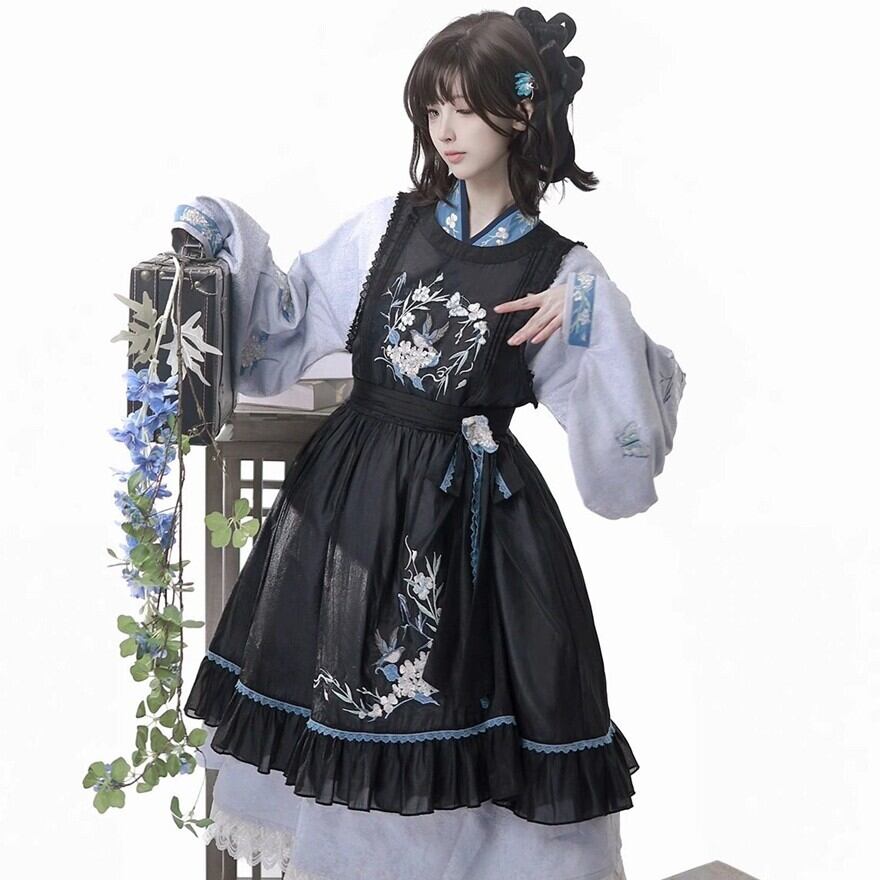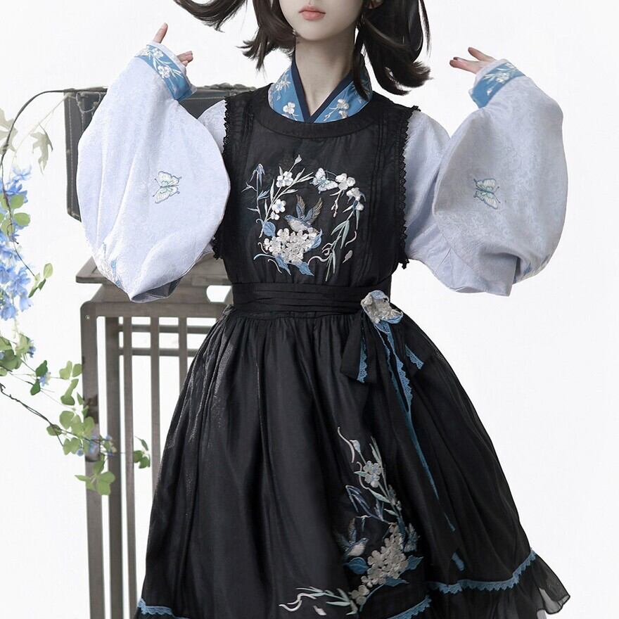 黒のジャンスカ風ワンピースに、くすみブルーの刺繍と配色が映えるセットです。クラシカルな落ち着きがありながら、衿まわりや袖の雰囲気に中華ロリィタらしい空気が混ざるのが魅力。甘さよりも“物語”をまといたい日に、静かに主役になれる一着です。