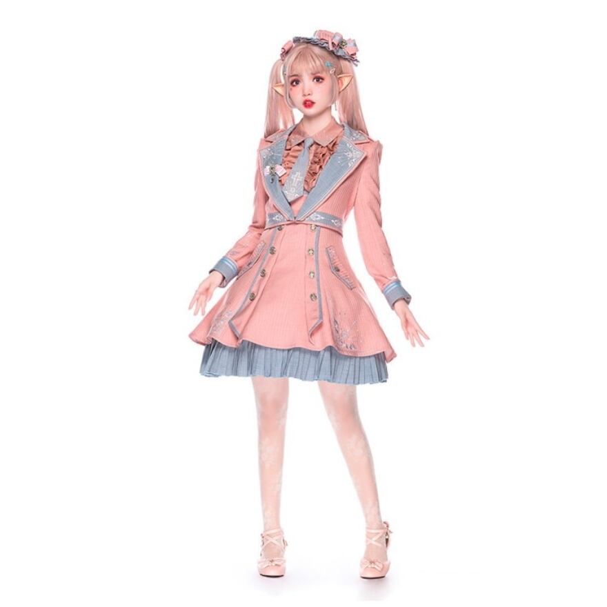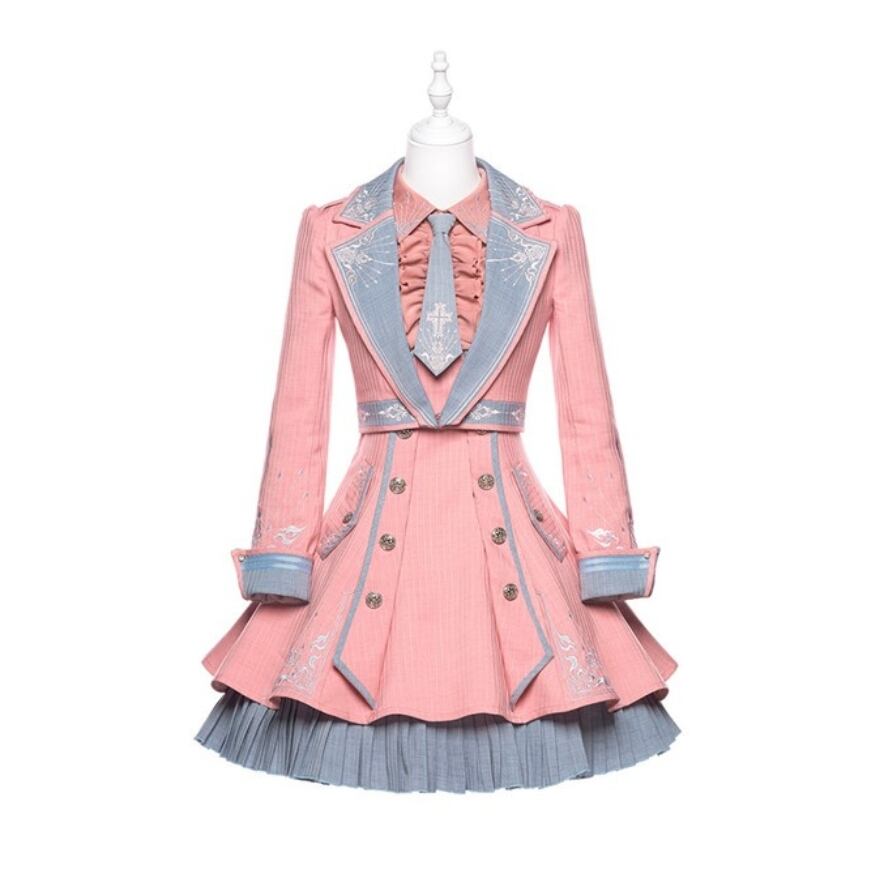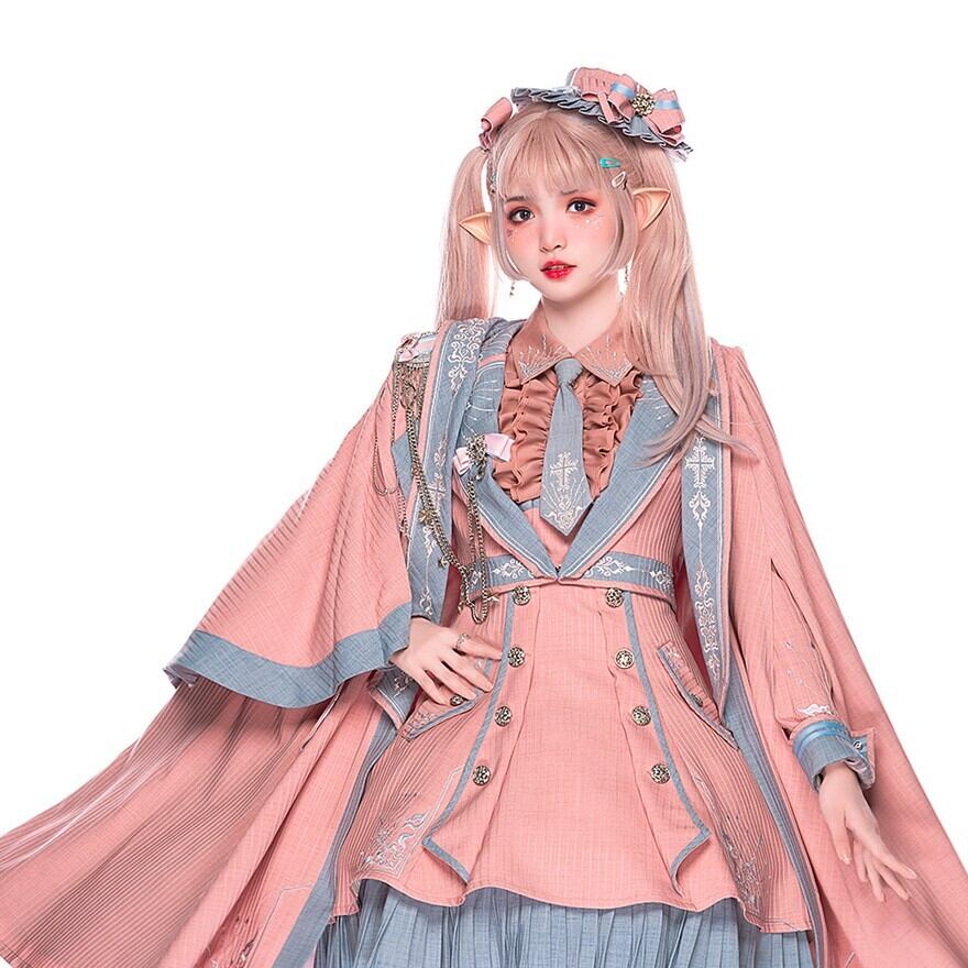 くすみピンクを主役に、やわらかなブルーグレーの装飾を重ねた王子系ロリータの一着です。胸元のフリルや装飾タイ、端正なボタン使いに加えて、肩から流れるようなケープ風デザインが視線を引き寄せます。凛とした気品がありながら色合いはやさしく、可愛さと格好よさの均衡を楽しみたい日に選びたくなる装いです。