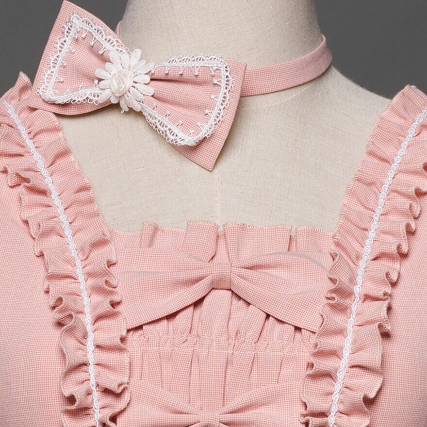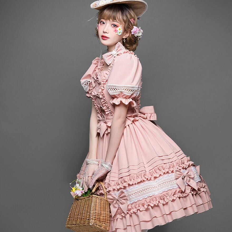 フリルとレースを多層的に配した半袖ロリィタワンピースです。胸元とウエストのリボン装飾、背面の編み上げ仕様によりシルエット調整が可能です。スカート部分は段フリル構造で、可愛らしさと立体感を両立したデザインです。
