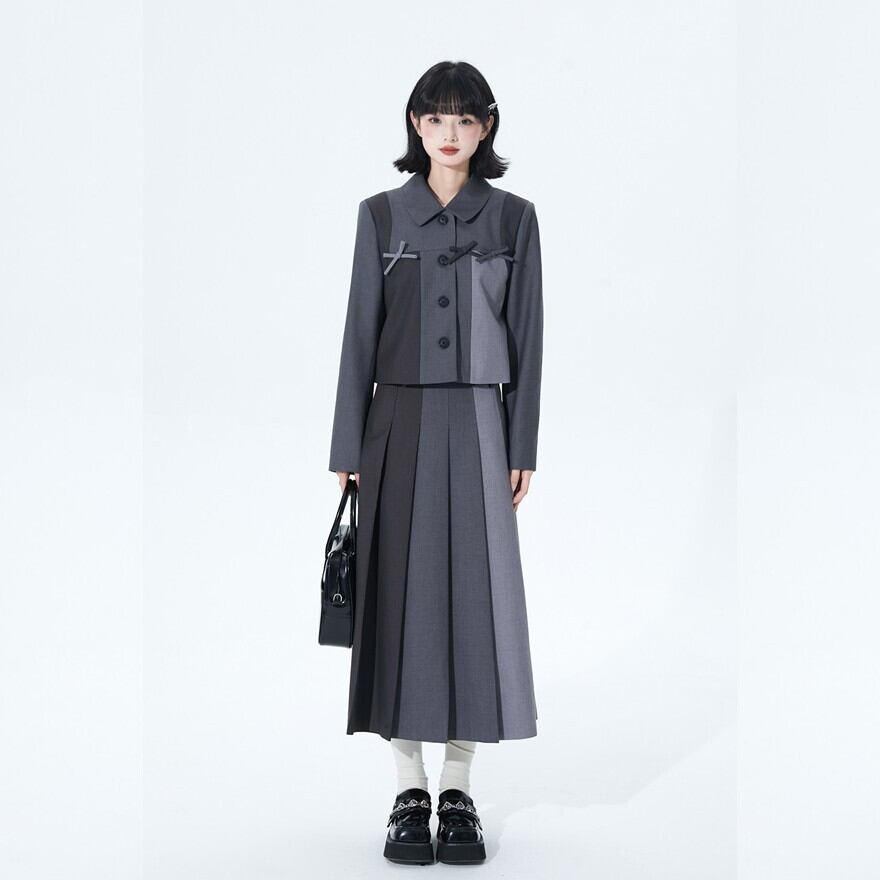 濃淡の異なるグレーを組み合わせた配色が印象的な、クラシカルロリータのセットアップです。短め丈のジャケットと長めのプリーツスカートが縦のラインをきれいに見せ、甘さを控えめにしながらも上品な可愛らしさを感じさせてくれます。整った印象がありながら堅くなりすぎず、日常のおでかけにも取り入れやすい一着です。