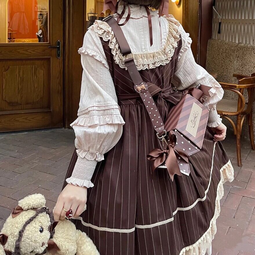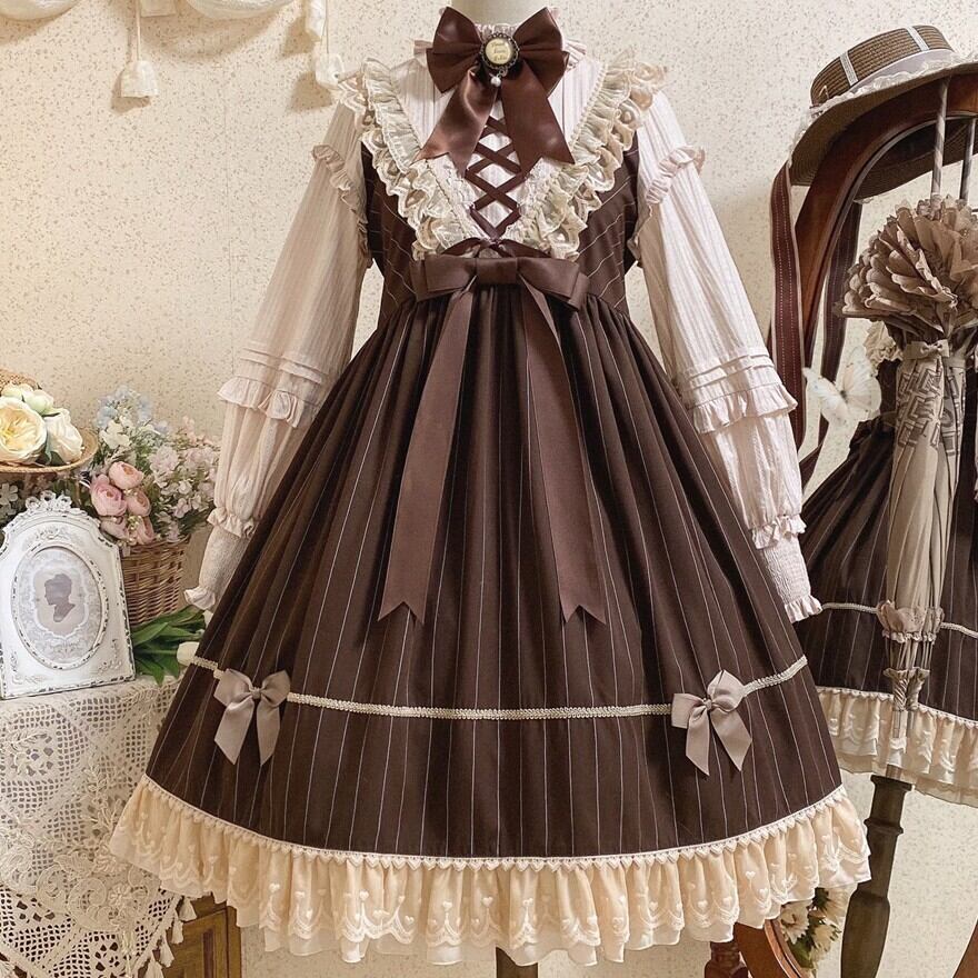 ブラウンのストライプ生地を基調に、生成りフリルを多層に重ねたクラシカルロリィタの長袖ワンピースです。胸元の編み上げ風デザインと大きめリボンが縦ラインを強調し、ウエスト切替から広がるAラインシルエットで上品な印象に仕上げています。