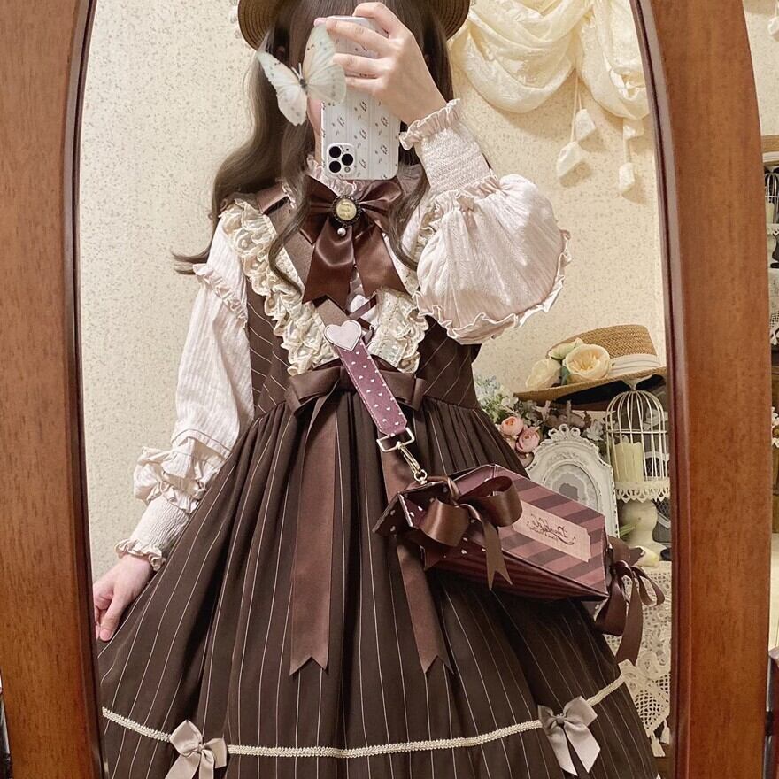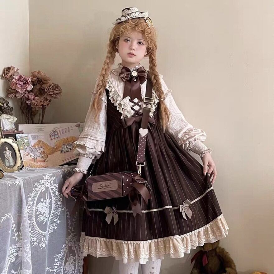 A. ベーシックなブラウン配色と長袖仕様で挑戦しやすく、初めてのクラロリにも適したデザインです。白い靴下・カチューシャとの組み合わせがおすすめです。