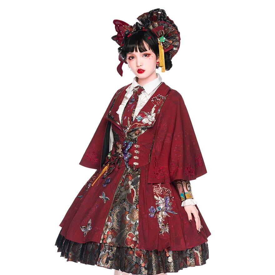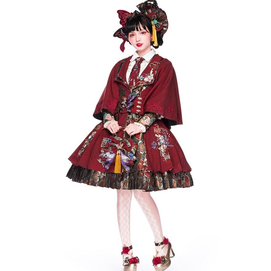 深みのあるボルドーカラーに繊細なフラワー刺繍を施した中華ロリィタ向けケープです。ショート丈設計でウエスト装飾やスカート柄を隠さず、重心を上げてすっきりとしたシルエットを作ります。