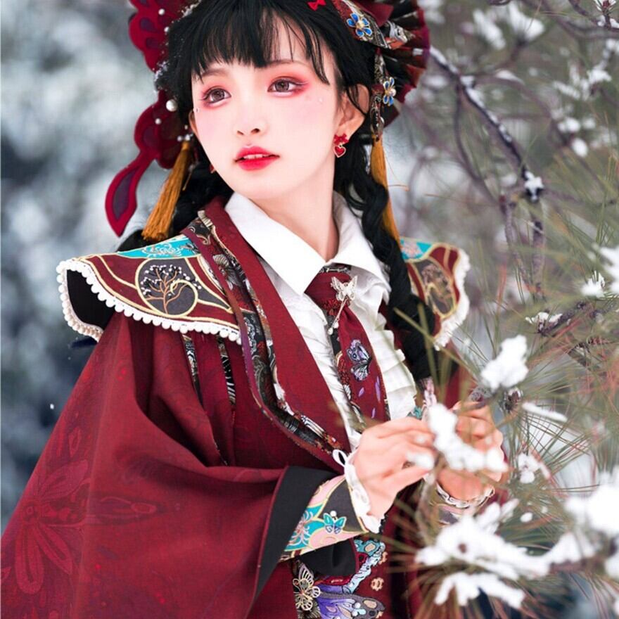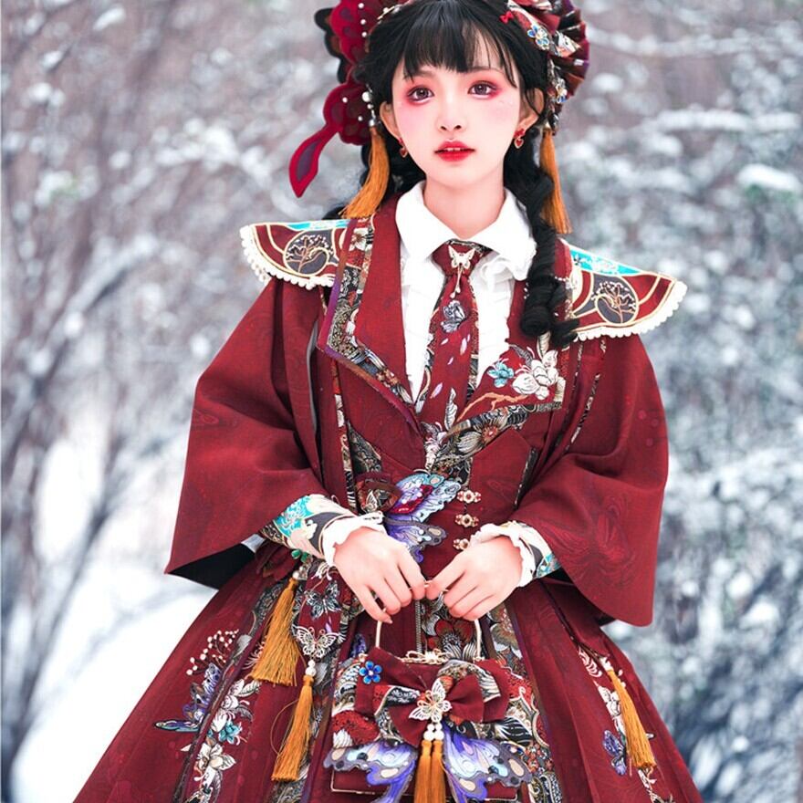 ・深紅ベースに蝶モチーフ刺繍ジャカード、段重ねスカートと雲肩・小斗篷による多層構造デザイン