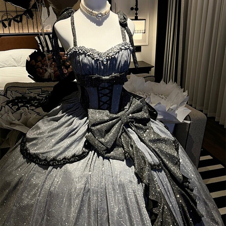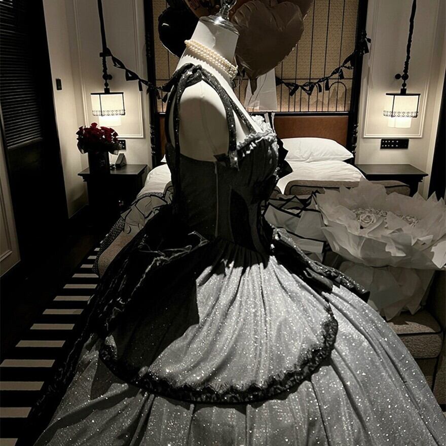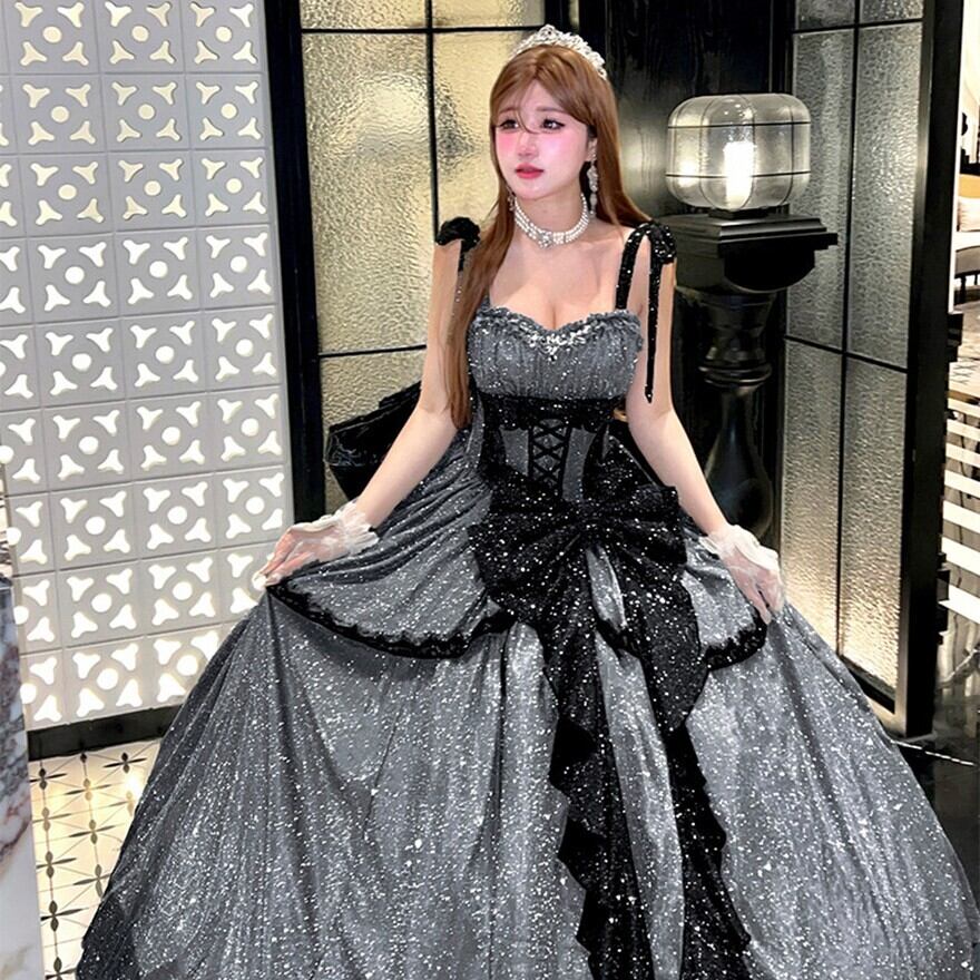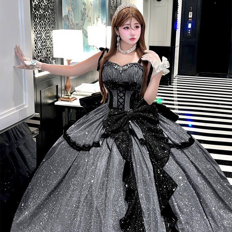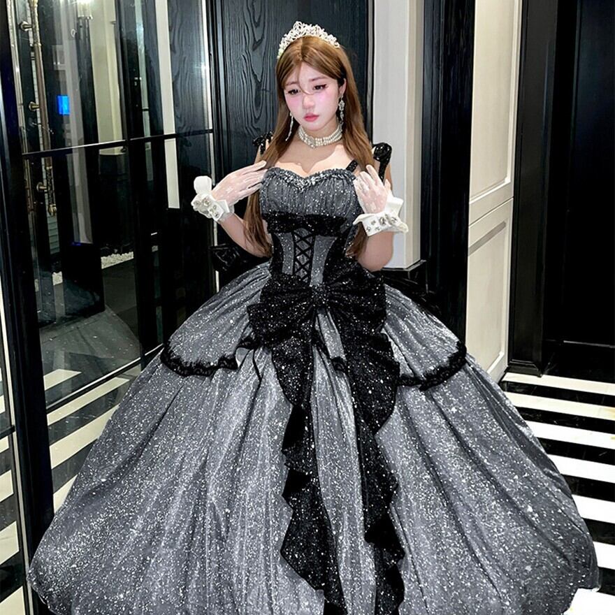 グレーとブラックの陰影にきらめきを重ねた、重厚感のあるゴシックロリータのパーティドレスです。胸元から裾へ流れる立体的なラインと大きなリボンが強い存在感をつくり、特別な夜にふさわしい華やかさを引き出します。甘さよりも気品とドラマ性を大切にしたい日に選びたくなる1着です。