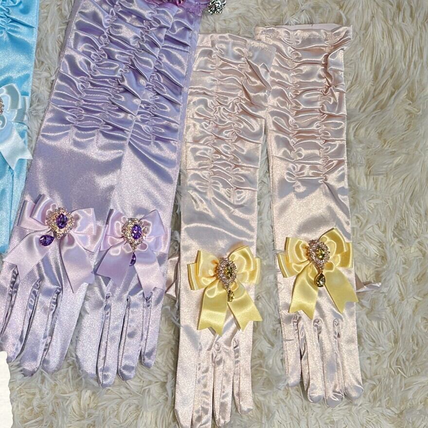 光沢のあるサテン調生地にフリルと立体装飾をあしらったロリィタ向けスリーブカバーです。肘上までのロング丈で腕全体に華やかさを加え、指先まで覆う仕様でコーディネートの印象を統一しやすいアクセサリーです。左右セット仕様。本商品は予約商品です。