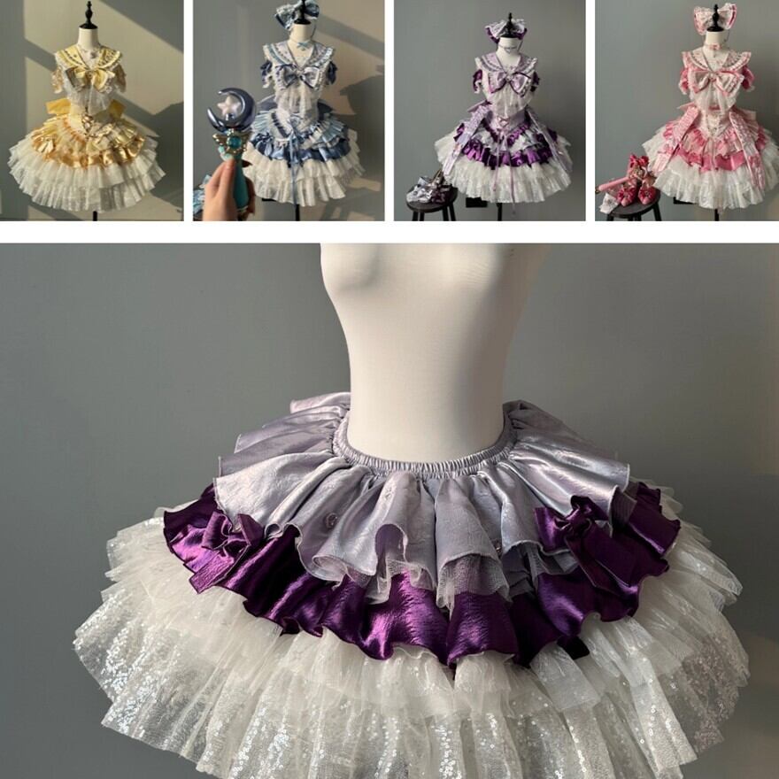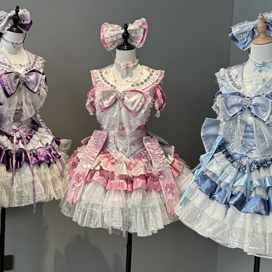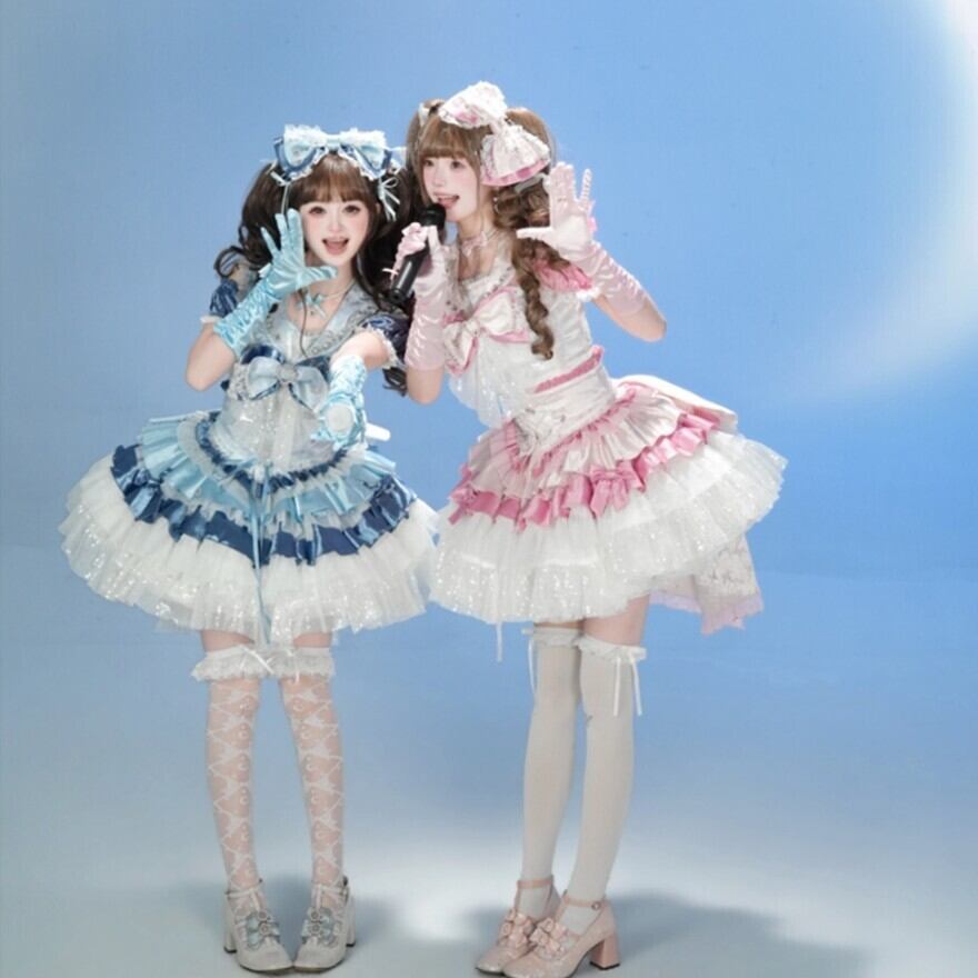 甘ロリより輝きとステージ映えを重視したアイドル特化型デザイン。明るいパステル展開でボリューム重視のフレアシルエットです。