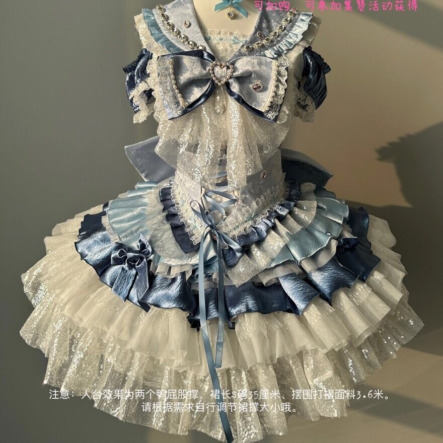 ラメ感のあるチュールと多段フリルを重ねた甘ロリアイドル系衣装です。大型リボン装飾付きトップスとボリュームのあるティアードスカートのセパレート仕様。背面リボンと胸元チャームで、ステージ映えする立体シルエットを演出します。本商品は予約商品です。